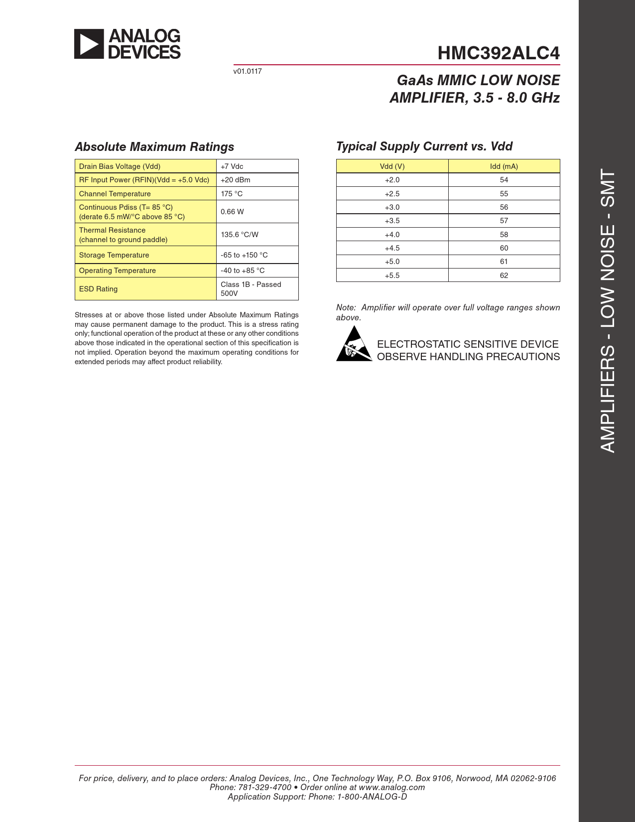 HMC392ALC4. GaAs MMIC LOW NOISE. AMPLIFIER, 3.5 - 8.0 GHz. Absolute Maximum Ratings. Typical Supply Current vs. Vdd