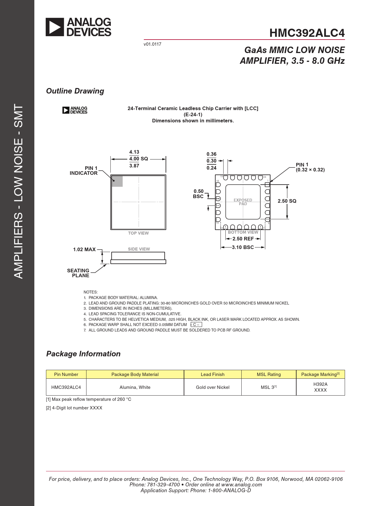 HMC392ALC4 v01.0117 GaAs MMIC LOW NOISEAMPLIFIER, 3.5 - 8.0 GHzOutline Drawing T 24-Terminal Ceramic Leadless Chip Carrier with [LCC] M (E-24-1)Dimensions shown in millimeters. E - S IS 4.130.36 O 4.00 SQ0.30PIN 13.870.24PIN 1(0.32 × 0.32)INDICATOR19 W N 24181 O 0.50BSCEXPOSED2.50 SQPAD S - L R 136 IE 127TOP VIEWBOTTOM VIEW2.50 REF LIF 1.02 MAXSIDE VIEW3.10 BSC P M A SEATINGPLANE NOTES: 1. PACKAGE BODY MATERIAL: ALUMINA. PKG-000000 2. LEAD AND GROUND PADDLE PLATING: 30-80 MICROINCHES GOLD OVER 50 MICROINCHES MINIMUM NICKEL 04-03-2015-A 3. DIMENSIONS ARE IN INCHES (MILLIMETERS). 4. LEAD SPACING TOLERANCE IS NON-CUMULATIVE. 5. CHARACTERS TO BE HELVETICA MEDIUM, .025 HIGH, BLACK INK, OR LASER MARK LOCATED APPROX. AS SHOWN. 6. PACKAGE WARP SHALL NOT EXCEED 0.05MM DATUM – C – 7. ALL GROUND LEADS AND GROUND PADDLE MUST BE SOLDERED TO PCB RF GROUND. Package Information Pin Number Package Body Material Lead Finish MSL Rating Package Marking[2] H392A HMC392ALC4 Alumina, White Gold over Nickel MSL 3[1] XXXX [1] Max peak reflow temperature of 260 °C [2] 4-Digit lot number XXXX For price, delivery, and to place orders: Analog Devices, Inc., One Technology Way, P.O. Box 9106, Norwood, MA 02062-9106 Phone: 781-329-4700 • Order online at www.analog.com Application Support: Phone: 1-800-ANALOG-D