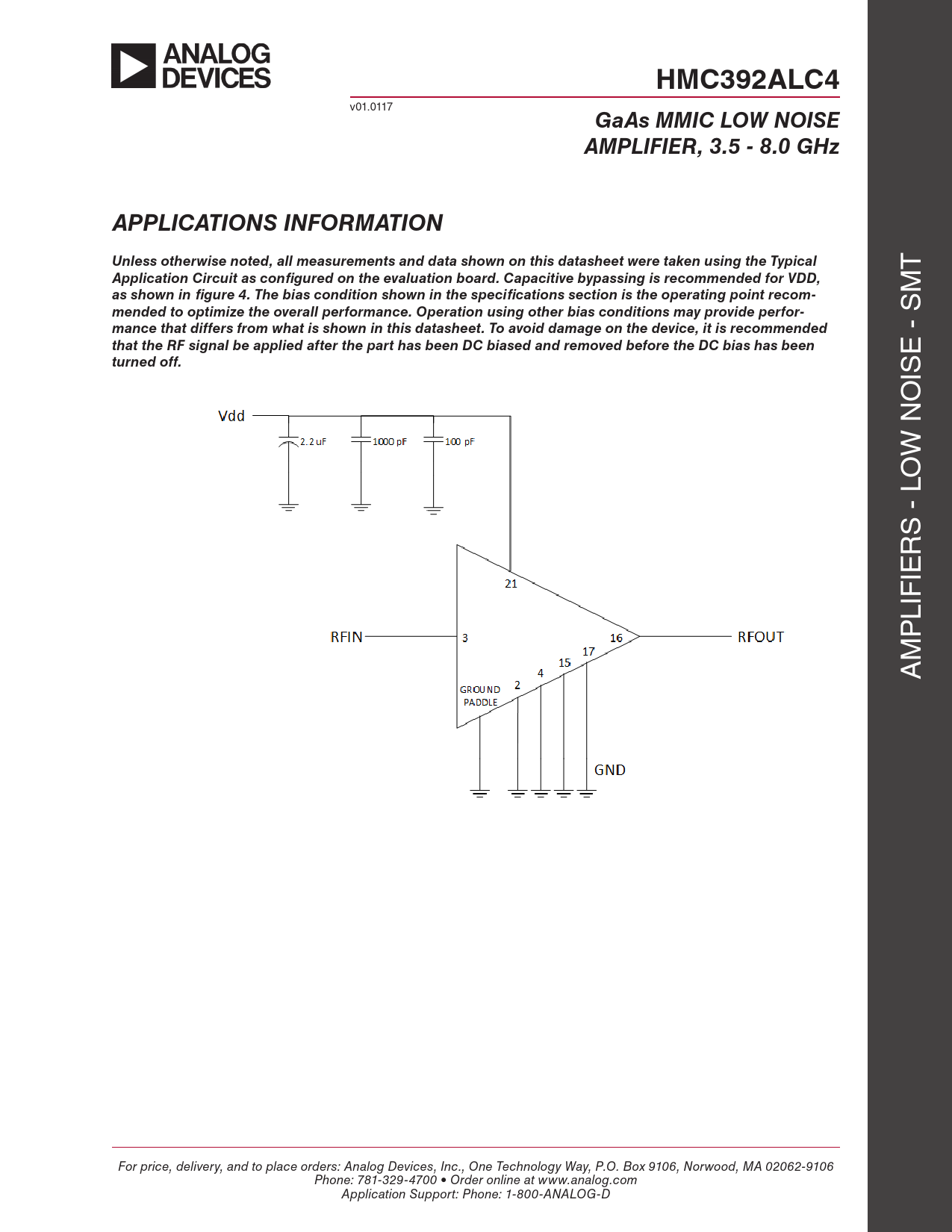 GaAs MMIC LOW NOISE AMPLIFIER, 3.5 - 8.0 GHz APPLICATIONS INFORMATION Unless otherwise noted, all measurements and data shown on this datasheet were taken using the Typical