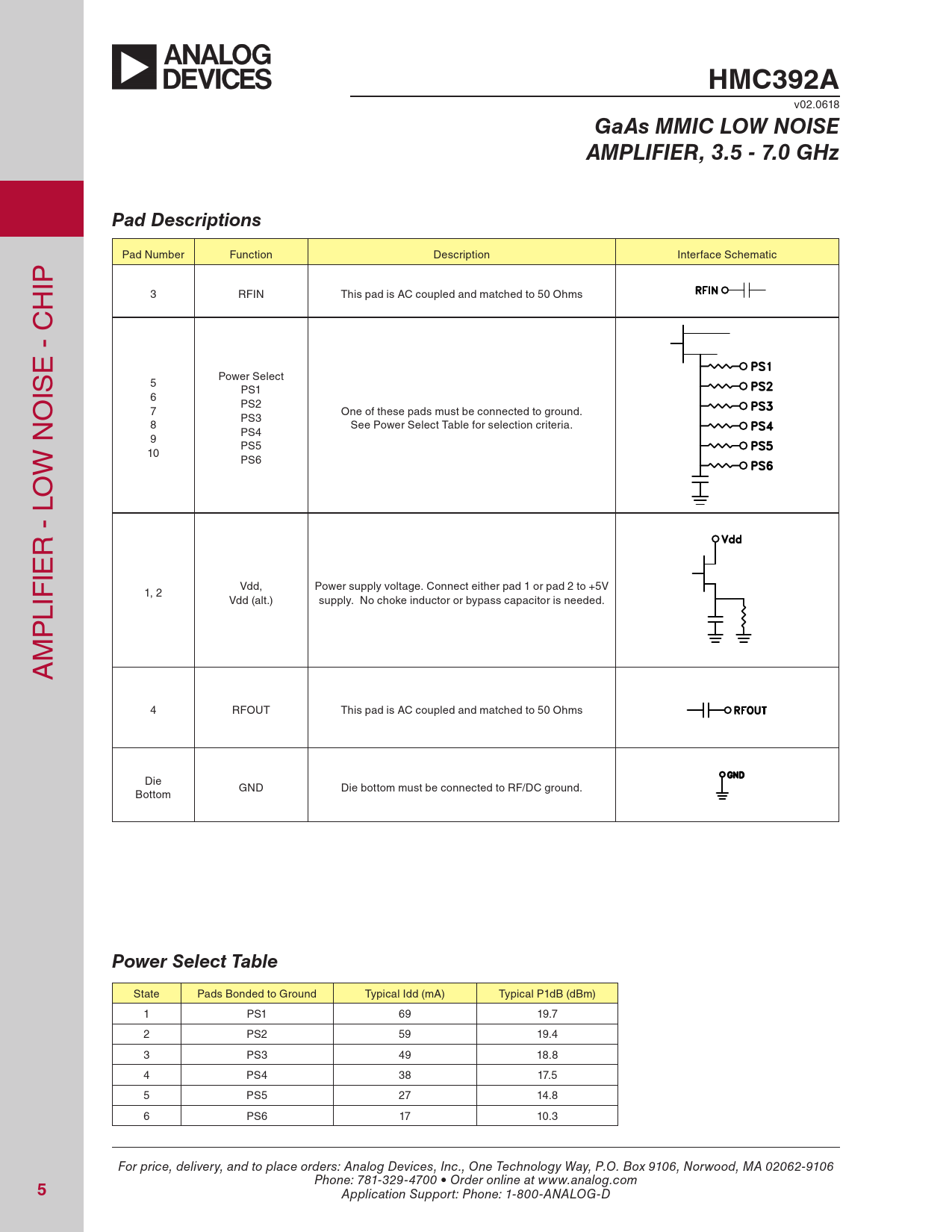HMC392A. GaAs MMIC LOW NOISE. AMPLIFIER, 3.5 - 7.0 GHz. Pad Descriptions. Power Select Table