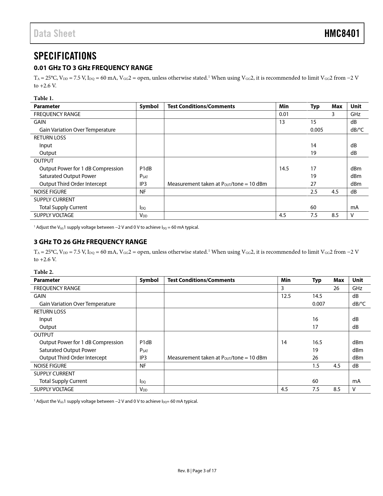 Data Sheet. HMC8401. SPECIFICATIONS 0.01 GHz TO 3 GHz FREQUENCY RANGE. Table 1. Parameter. Symbol. Test Conditions/Comments. Min. Typ