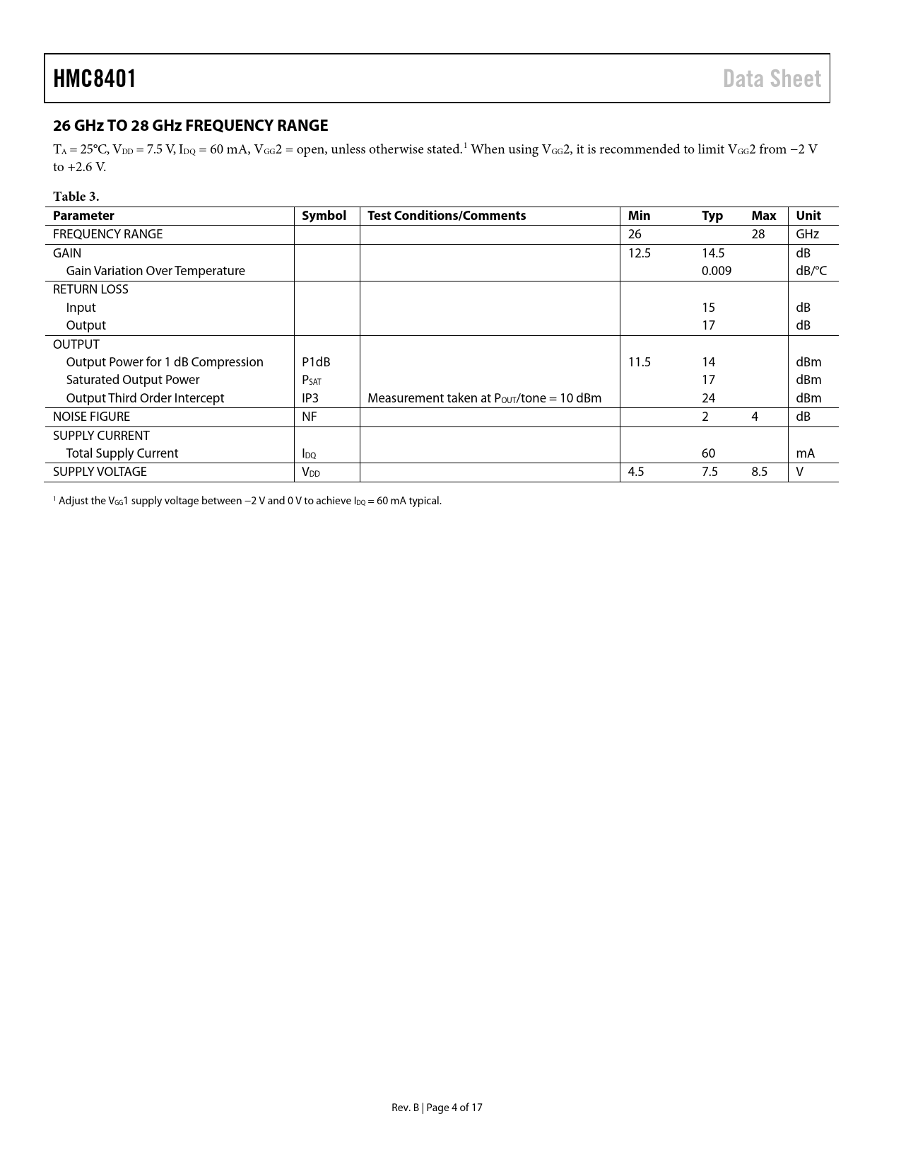 HMC8401. Data Sheet. 26 GHz TO 28 GHz FREQUENCY RANGE. Table 3. Parameter. Symbol. Test Conditions/Comments. Min. Typ. Max. Unit