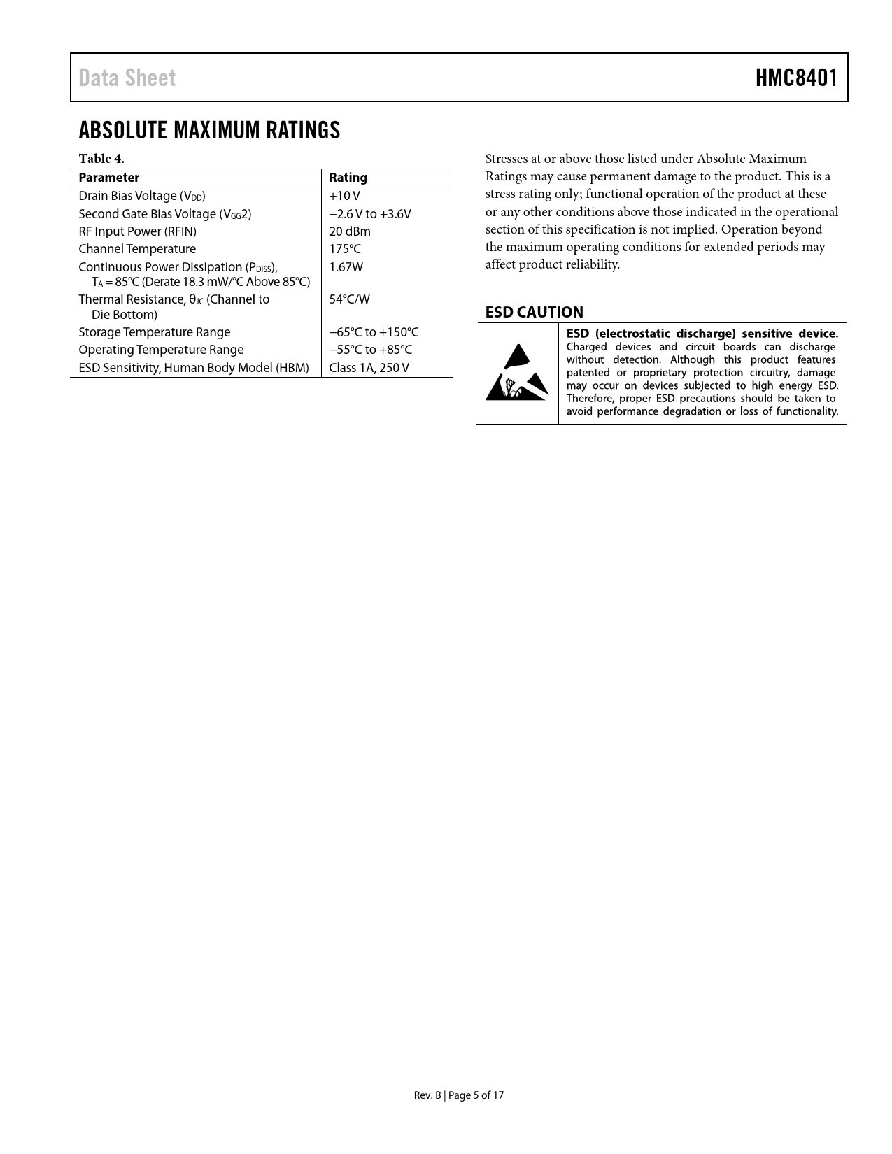 Data Sheet HMC8401 ABSOLUTE MAXIMUM RATINGS Table 4 Parameter Rating ESD CAUTION