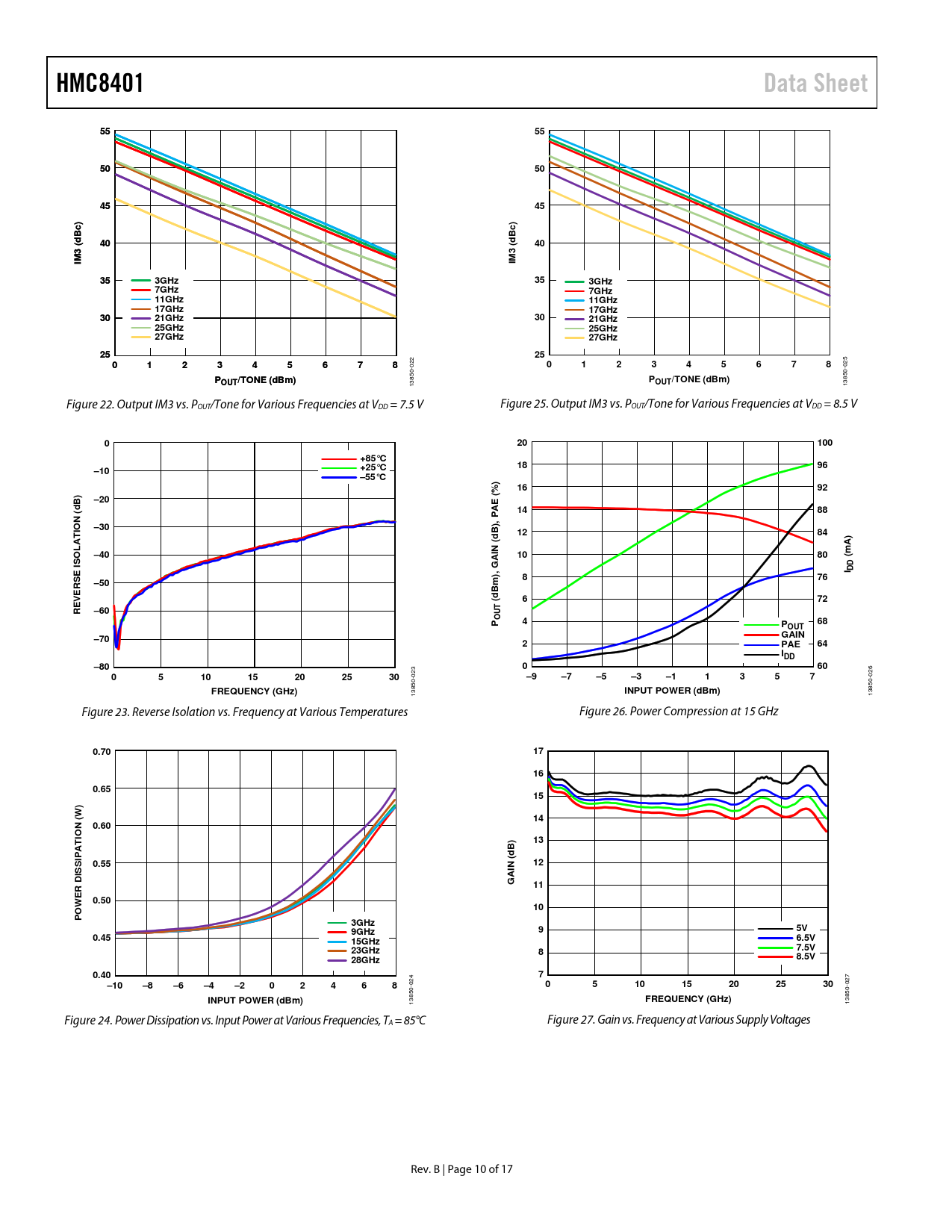HMC8401Data Sheet555550504545Bc)Bc)dd(40((40IM3IM3353GHz353GHz7GHz7GHz11GHz11GHz17GHz17GHz3021GHz3021GHz25GHz25GHz27GHz27GHz2525012345678 022 012345678 025 POP UT/TONE (dBm)UT/TONE (dBmP 13850- OUT/TONE (dBm) 13850- Figure 22. Output IM3 vs. POUT/Tone for Various Frequencies at VDD = 7.5 V Figure 25. Output IM3 vs. POUT/Tone for Various Frequencies at VDD = 8.5 V 020100+85°C1896–10+25°C –55°C)1692B)–20E (%d (1488NPA ),IO–30BT1284A(dLmA)–40IN1080(SOA G ),I DDSE I876–50Bm d (672EVER R–60UT OP468POUT–70GAIN2PAE64IDD–80060051015202530 023 –9–7–5–3–11357 026 FREQUENCY (GHz)INPUT POWER (dBm) 13850- 13850- Figure 23. Reverse Isolation vs. Frequency at Various Temperatures Figure 26. Power Compression at 15 GHz 0.7017160.6515)(W14N0.60IO T13B)PAd (0.5512INISSI DGA11ER W0.5010PO3GHz 9GHz95V0.4515GHz6.5V23GHz7.5V828GHz8.5V0.407–10–8–6–4–202468 024 051015202530 027 INPUT POWER (dBm)FREQUENCY (GHz) 13850- 13850- Figure 24. Power Dissipation vs. Input Power at Various Frequencies, TA = 85°C Figure 27. Gain vs. Frequency at Various Supply Voltages Rev. B | Page 10 of 17 Document Outline Features Applications General Description Functional Block Diagram Table of Contents Revision History Specifications 0.01 GHz to 3 GHz Frequency Range 3 GHz to 26 GHz Frequency Range 26 GHz to 28 GHz Frequency Range Absolute Maximum Ratings ESD Caution Pin Configuration and Function Descriptions Interface Schematics Typical Performance Characteristics Theory of Operation Applications Information Biasing Procedures Mounting and Bonding Techniques for Millimeterwave GaAs MMICs Handling Precautions Mounting Eutectic Die Attach Epoxy Die Attach Wire Bonding Typical Application Circuit Assembly Diagram Outline Dimensions Ordering Guide