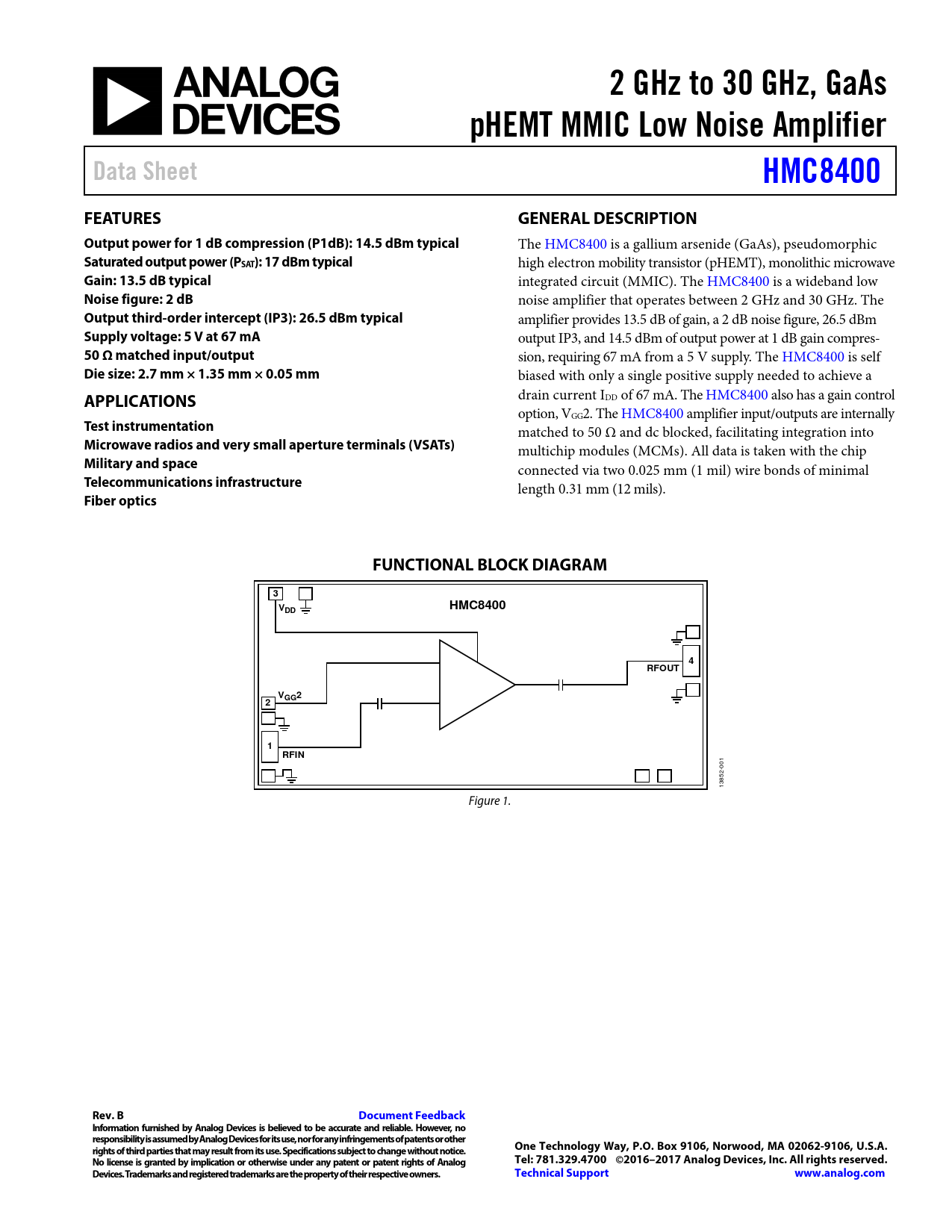 2 GHz to 30 GHz, GaAs. pHEMT MMIC Low Noise Amplifier. Data Sheet. HMC8400. FEATURES. GENERAL DESCRIPTION
