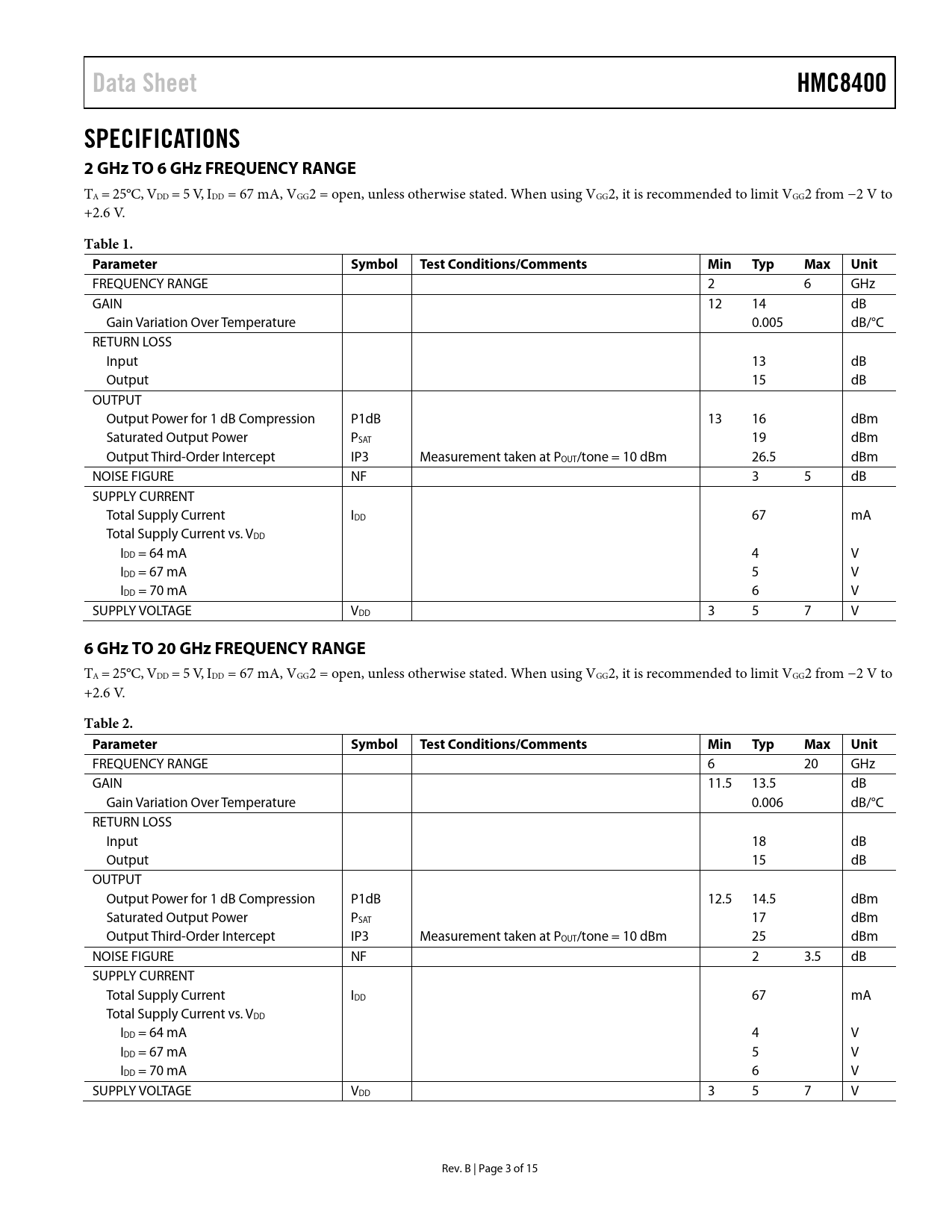 Pages / Page15 / 3 — Data Sheet. HMC8400. SPECIFICATIONS 2 GHz TO 6 GHz FREQUENCY RANGE. Table …