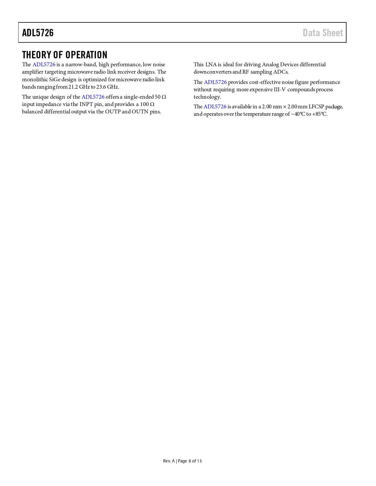 Pages / Page13 / 8 — ADL5726. Data Sheet. THEORY OF OPERATION