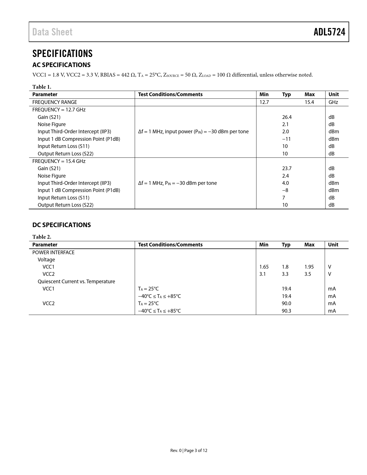 Data SheetADL5724SPECIFICATIONS AC SPECIFICATIONS VCC1 = 1.8 V, VCC2 = 3.3 V, RBIAS = 442 Ω, TA = 25°C, ZSOURCE = 50 Ω, ZLOAD = 100 Ω differential, unless otherwise noted. Table 1. ParameterTest Conditions/CommentsMinTypMaxUnit FREQUENCY RANGE 12.7 15.4 GHz FREQUENCY = 12.7 GHz Gain (S21) 26.4 dB Noise Figure 2.1 dB Input Third-Order Intercept (IIP3) Δf = 1 MHz, input power (PIN) = −30 dBm per tone 2.0 dBm Input 1 dB Compression Point (P1dB) −11 dBm Input Return Loss (S11) 10 dB Output Return Loss (S22) 10 dB FREQUENCY = 15.4 GHz Gain (S21) 23.7 dB Noise Figure 2.4 dB Input Third-Order Intercept (IIP3) Δf = 1 MHz, PIN = −30 dBm per tone 4.0 dBm Input 1 dB Compression Point (P1dB) −8 dBm Input Return Loss (S11) 7 dB Output Return Loss (S22) 10 dB DC SPECIFICATIONSTable 2. ParameterTest Conditions/CommentsMinTypMaxUnit POWER INTERFACE Voltage VCC1 1.65 1.8 1.95 V VCC2 3.1 3.3 3.5 V Quiescent Current vs. Temperature VCC1 TA = 25°C 19.4 mA −40°C ≤ TA ≤ +85°C 19.4 mA VCC2 TA = 25°C 90.0 mA −40°C ≤ TA ≤ +85°C 90.3 mA Rev. 0 | Page 3 of 12 Document Outline FEATURES APPLICATIONS FUNCTIONAL BLOCK DIAGRAM GENERAL DESCRIPTION TABLE OF CONTENTS REVISION HISTORY SPECIFICATIONS AC SPECIFICATIONS DC SPECIFICATIONS ABSOLUTE MAXIMUM RATINGS THERMAL RESISTANCE ESD CAUTION PIN CONFIGURATION AND FUNCTION DESCRIPTIONS TYPICAL PERFORMANCE CHARACTERISTICS THEORY OF OPERATION APPLICATIONS INFORMATION LAYOUT DIFFERENTIAL vs. SINGLE-ENDED OUTPUT EVALUATION BOARD INITIAL SETUP RESULTS BASIC CONNECTIONS FOR OPERATION OUTLINE DIMENSIONS ORDERING GUIDE