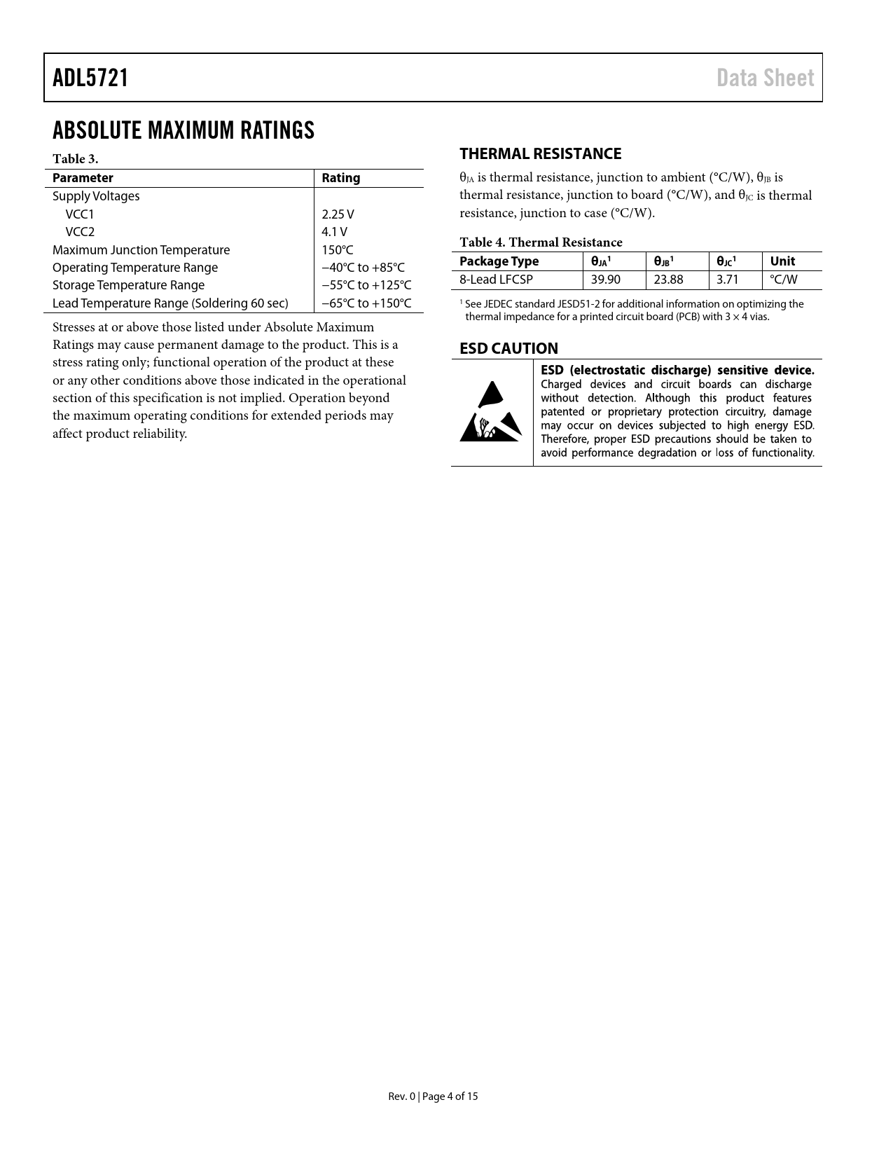 Pages / Page15 / 4 — ADL5721. Data Sheet. ABSOLUTE MAXIMUM RATINGS Table 3. THERMAL …