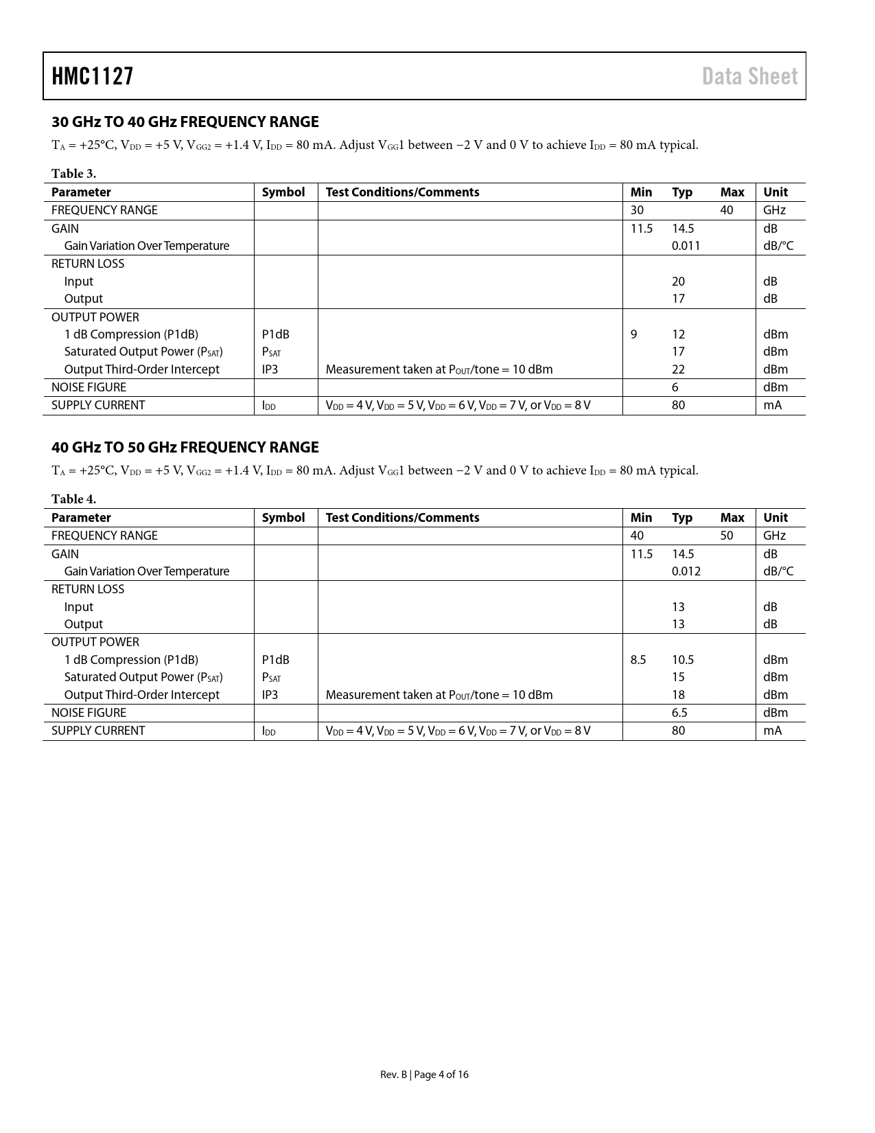 HMC1127Data Sheet30 GHz TO 40 GHz FREQUENCY RANGE TA = +25°C, VDD = +5 V, VGG2 = +1.4 V, IDD = 80 mA. Adjust VGG1 between −2 V and 0 V to achieve IDD = 80 mA typical. Table 3. ParameterSymbolTest Conditions/CommentsMinTypMaxUnit FREQUENCY RANGE 30 40 GHz GAIN 11.5 14.5 dB Gain Variation Over Temperature 0.011 dB/°C RETURN LOSS Input 20 dB Output 17 dB OUTPUT POWER 1 dB Compression (P1dB) P1dB 9 12 dBm Saturated Output Power (PSAT) PSAT 17 dBm Output Third-Order Intercept IP3 Measurement taken at POUT/tone = 10 dBm 22 dBm NOISE FIGURE 6 dBm SUPPLY CURRENT IDD VDD = 4 V, VDD = 5 V, VDD = 6 V, VDD = 7 V, or VDD = 8 V 80 mA 40 GHz TO 50 GHz FREQUENCY RANGE TA = +25°C, VDD = +5 V, VGG2 = +1.4 V, IDD = 80 mA. Adjust VGG1 between −2 V and 0 V to achieve IDD = 80 mA typical. Table 4. ParameterSymbolTest Conditions/CommentsMinTypMaxUnit FREQUENCY RANGE 40 50 GHz GAIN 11.5 14.5 dB Gain Variation Over Temperature 0.012 dB/°C RETURN LOSS Input 13 dB Output 13 dB OUTPUT POWER 1 dB Compression (P1dB) P1dB 8.5 10.5 dBm Saturated Output Power (PSAT) PSAT 15 dBm Output Third-Order Intercept IP3 Measurement taken at POUT/tone = 10 dBm 18 dBm NOISE FIGURE 6.5 dBm SUPPLY CURRENT IDD VDD = 4 V, VDD = 5 V, VDD = 6 V, VDD = 7 V, or VDD = 8 V 80 mA Rev. B | Page 4 of 16 Document Outline FEATURES APPLICATIONS FUNCTIONAL BLOCK DIAGRAM GENERAL DESCRIPTION REVISION HISTORY 2 GHz TO 8 GHz FREQUENCY RANGE 8 GHz TO 30 GHz FREQUENCY RANGE 30 GHz TO 40 GHz FREQUENCY RANGE 40 GHz TO 50 GHz FREQUENCY RANGE ESD CAUTION INTERFACE SCHEMATICS MOUNTING AND BONDING TECHNIQUES FOR MILLIMETERWAVE GAAS MMICS Handling Precautions Mounting Wire Bonding ASSEMBLY DIAGRAM ORDERING GUIDE