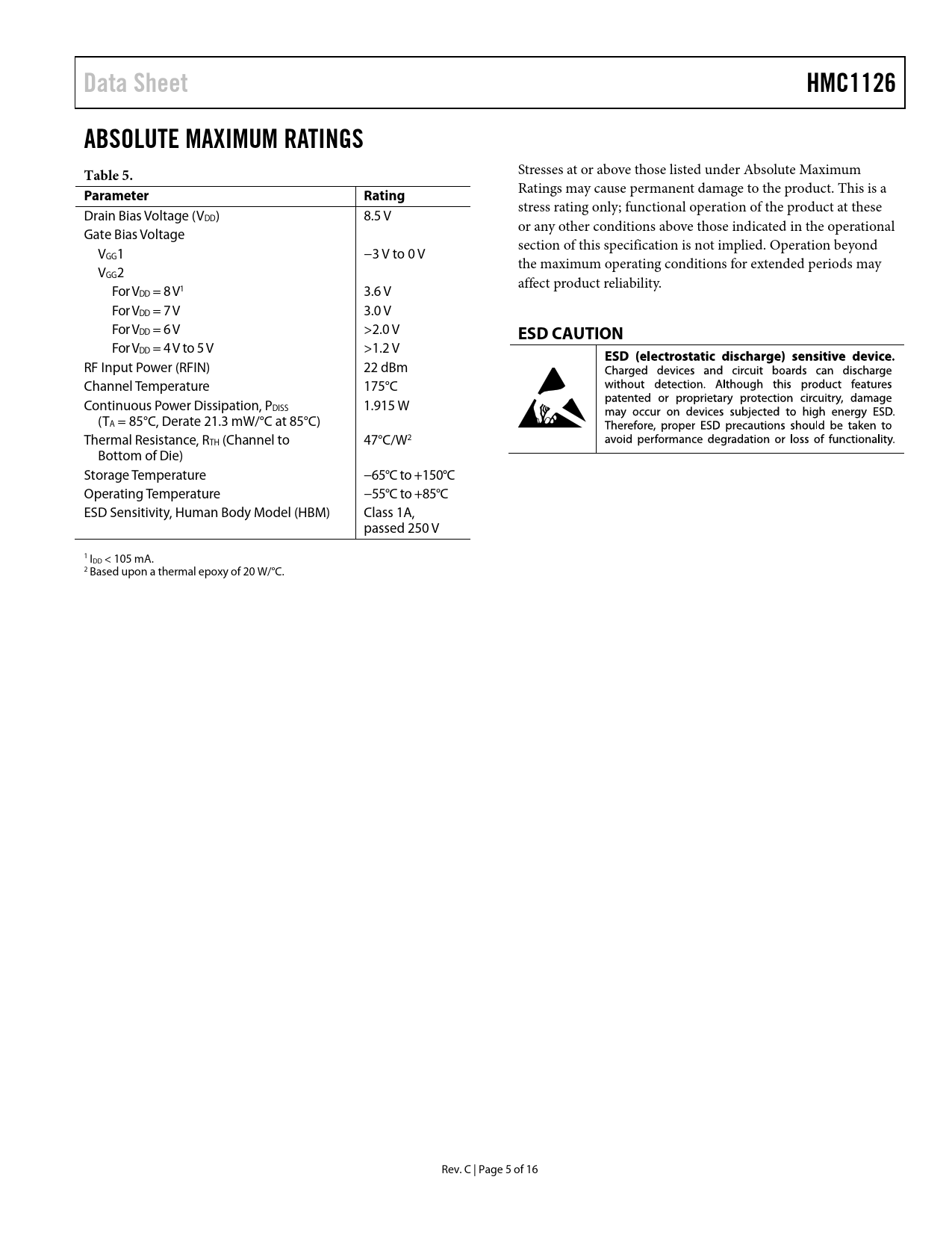 Data Sheet HMC1126 ABSOLUTE MAXIMUM RATINGS Table 5 Parameter Rating ESD CAUTION