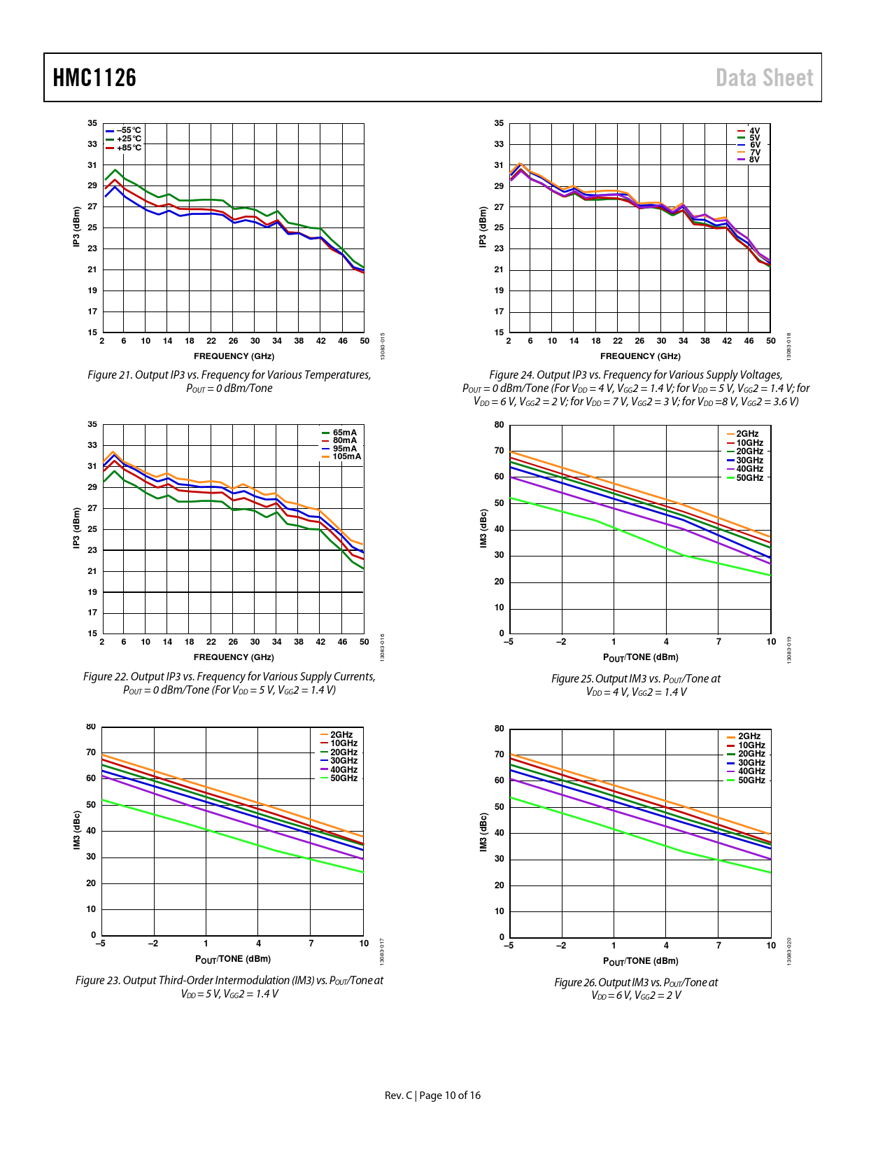 HMC1126 Data Sheet –55°C +25°C +85°C Bm) 3 ( FREQUENCY (GHz) 65mA 2GHz 80mA 10GHz 95mA 20GHz 105mA 30GHz 40GHz 50GHz Bc) POUT/TONE (dBm)