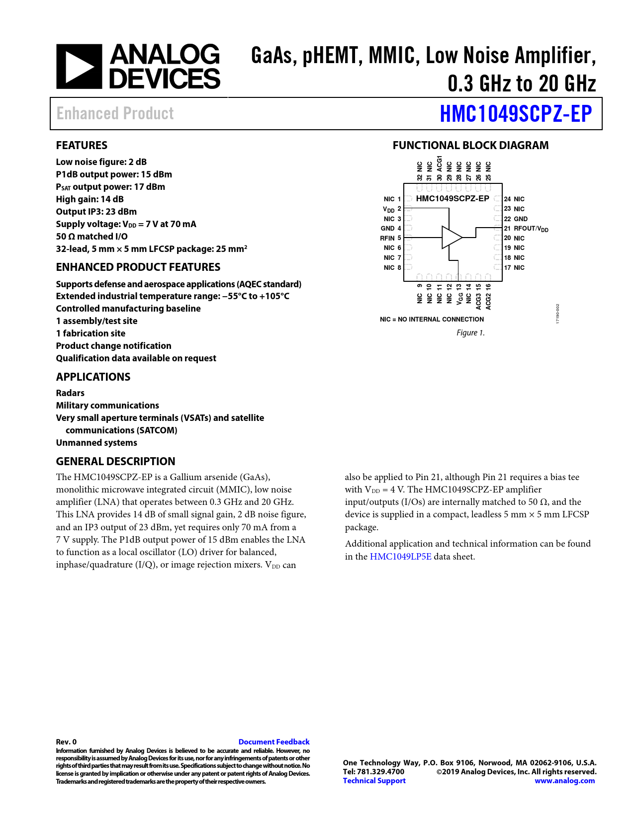 GaAs, pHEMT, MMIC, Low Noise Amplifier,. 0.3 GHz to 20 GHz. Enhanced Product. HMC1049SCPZ-EP. FEATURES. FUNCTIONAL BLOCK DIAGRAM
