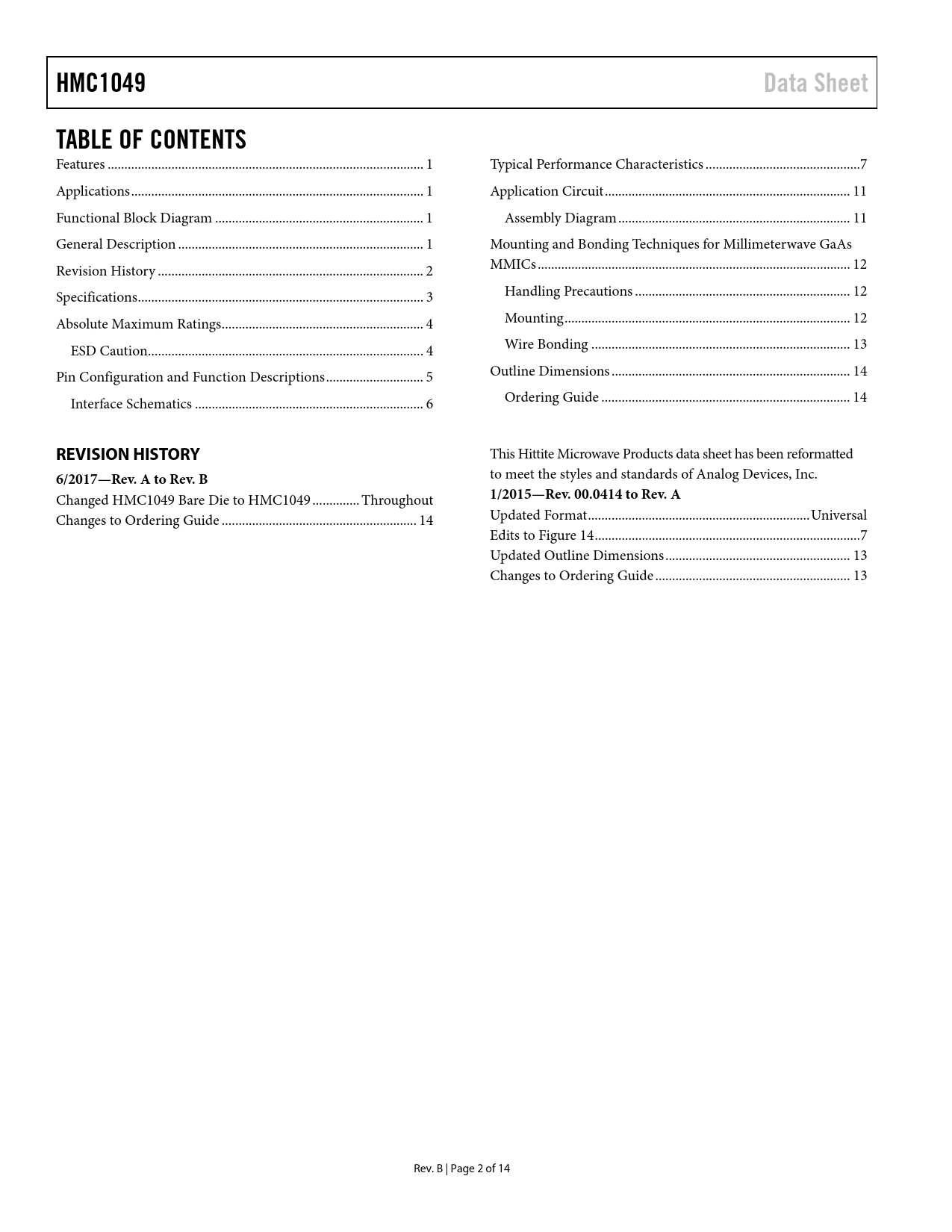link to page 1 link to page 1 link to page 1 link to page 1 link to page 2 link to page 3 link to page 4 link to page 4 link to page 5 link to page 6 link to page 7 link to page 11 link to page 11 link to page 12 link to page 12 link to page 12 link to page 12 link to page 13 link to page 14 link to page 14 HMC1049Data SheetTABLE OF CONTENTS Features .. 1 Typical Performance Characteristics ..7 Applications ... 1 Application Circuit ... 11 Functional Block Diagram .. 1 Assembly Diagram ... 11 General Description ... 1 Mounting and Bonding Techniques for Millimeterwave GaAs Revision History ... 2 MMICs ... 12 Specifications ... 3 Handling Precautions .. 12 Absolute Maximum Ratings .. 4 Mounting ... 12 ESD Caution.. 4 Wire Bonding ... 13 Pin Configuration and Function Descriptions ... 5 Outline Dimensions ... 14 Interface Schematics .. 6 Ordering Guide .. 14 REVISION HISTORY This Hittite Microwave Products data sheet has been reformatted 6/2017—Rev. A to Rev. B to meet the styles and standards of Analog Devices, Inc. Changed HMC1049 Bare Die to HMC1049 .. Throughout 1/2015—Rev. 00.0414 to Rev. A Changes to Ordering Guide .. 14 Updated Format .. Universal Edits to Figure 14 ... 7 Updated Outline Dimensions ... 13 Changes to Ordering Guide .. 13 Rev. B | Page 2 of 14 Document Outline Features Applications Functional Block Diagram General Description Revision History Specifications Absolute Maximum Ratings ESD Caution PIN Configuration and Function Descriptions Interface Schematics Typical Performance Characteristics Application Circuit Assembly Diagram Mounting and Bonding Techniques for Millimeterwave GaAs MMICs Handling Precautions Storage Cleanliness Static Sensitivity Transients General Handling Mounting Eutectic Die Attach Epoxy Die Attach Wire Bonding Outline Dimensions Ordering Guide