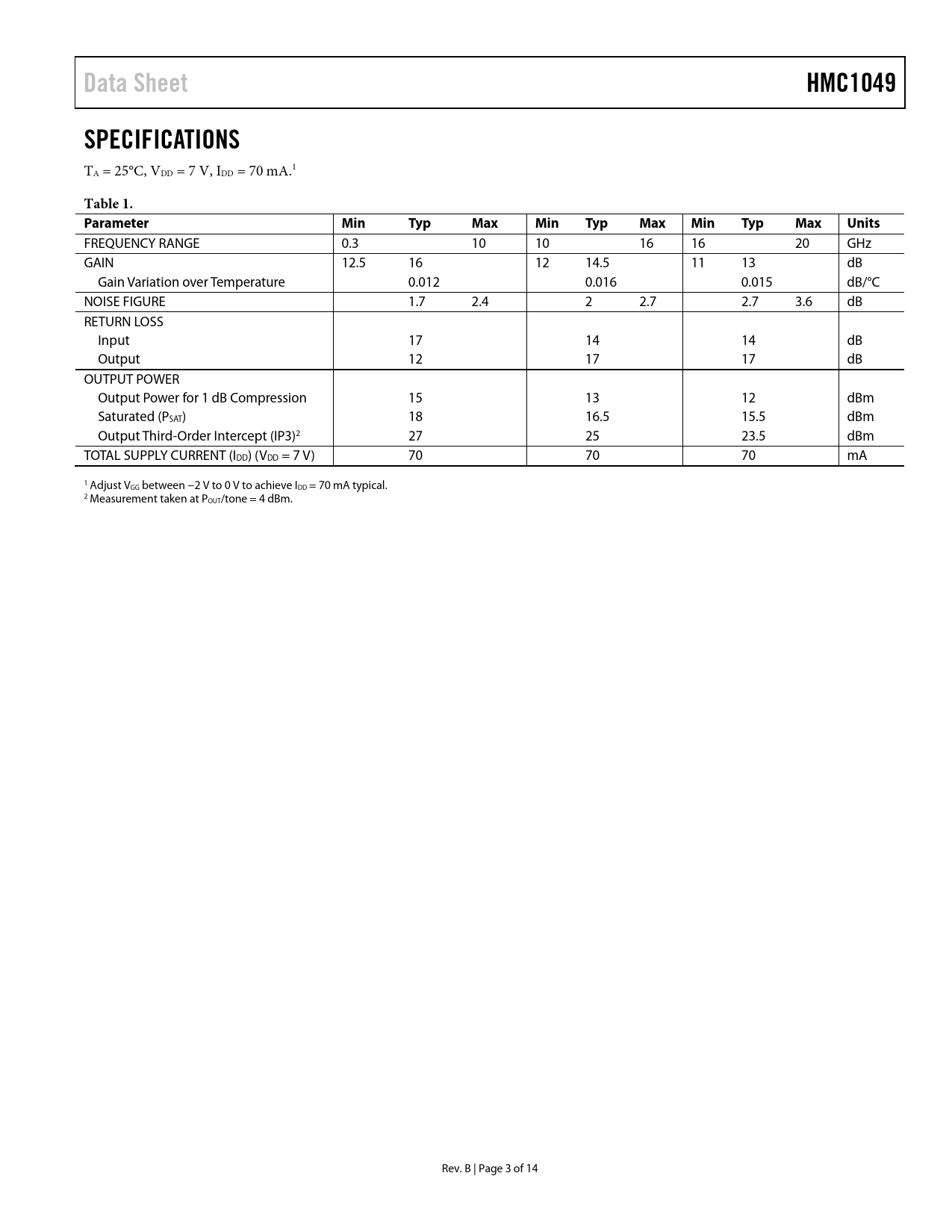Pages / Page14 / 3 — Data Sheet. HMC1049. SPECIFICATIONS. Table 1. Parameter. Min. Typ. Max. …