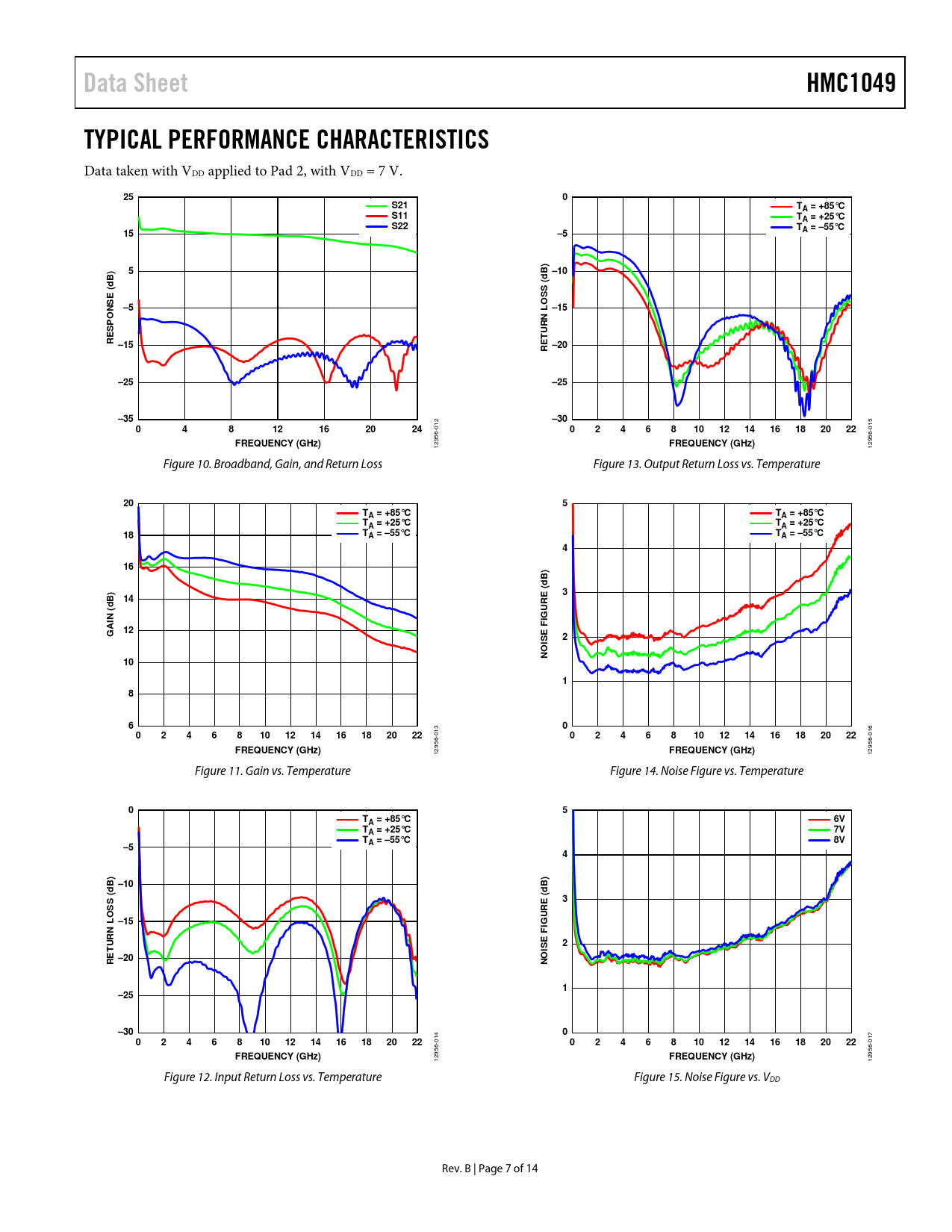 Data SheetHMC1049TYPICAL PERFORMANCE CHARACTERISTICS Data taken with VDD applied to Pad 2, with VDD = 7 V. 250S21TA = +85°CS11TA = +25°CS22TA = –55°C15–5)5B) –10Bd ( S SSE (dON–5–15URN LESPOTR –15–20RE–25–25–35–3004812162024 012 0246810121416182022 015 FREQUENCY (GHz) 12956- FREQUENCY (GHz) 12956- Figure 10. Broadband, Gain, and Return Loss Figure 13. Output Return Loss vs. Temperature 205TA = +85°CTA = +85°CTA = +25°CTA = +25°C18TA = –55°CTA = –55°C416) dB (3B)14EdRN ( AI12FIGUGE2OIS N1018600246810121416182022 013 0246810121416182022 016 FREQUENCY (GHz) 12956- FREQUENCY (GHz) 12956- Figure 11. Gain vs. Temperature Figure 14. Noise Figure vs. Temperature 05TA = +85°C6VTA = +25°C7VTA = –55°C8V–54)B) –10ddB((S3ESRO –15FIGUURN LE2T–20OISREN1–25–3000246810121416182022 014 0246810121416182022 017 FREQUENCY (GHz) 12956- FREQUENCY (GHz) 12956- Figure 12. Input Return Loss vs. Temperature Figure 15. Noise Figure vs. VDD Rev. B | Page 7 of 14 Document Outline Features Applications Functional Block Diagram General Description Revision History Specifications Absolute Maximum Ratings ESD Caution PIN Configuration and Function Descriptions Interface Schematics Typical Performance Characteristics Application Circuit Assembly Diagram Mounting and Bonding Techniques for Millimeterwave GaAs MMICs Handling Precautions Storage Cleanliness Static Sensitivity Transients General Handling Mounting Eutectic Die Attach Epoxy Die Attach Wire Bonding Outline Dimensions Ordering Guide