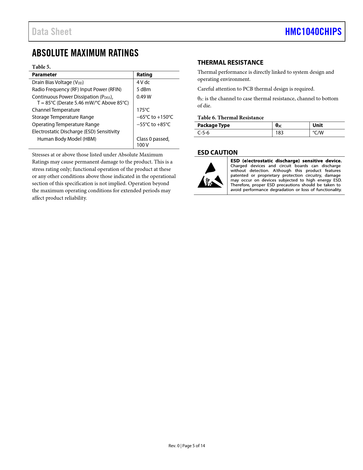 Pages / Page14 / 5 — Data Sheet. HMC1040CHIPS. ABSOLUTE MAXIMUM RATINGS. THERMAL RESISTANCE. …