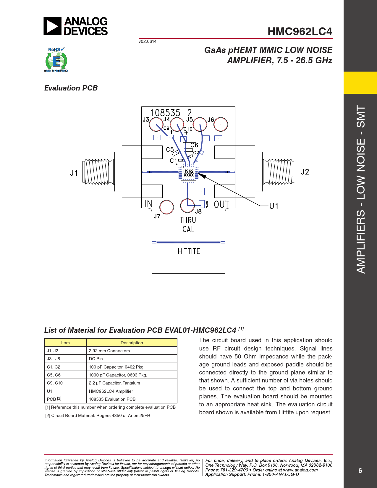 HMC962LC4. GaAs pHEMT MMIC LOW NOISE. AMPLIFIER, 7.5 - 26.5 GHz. Evaluation PCB