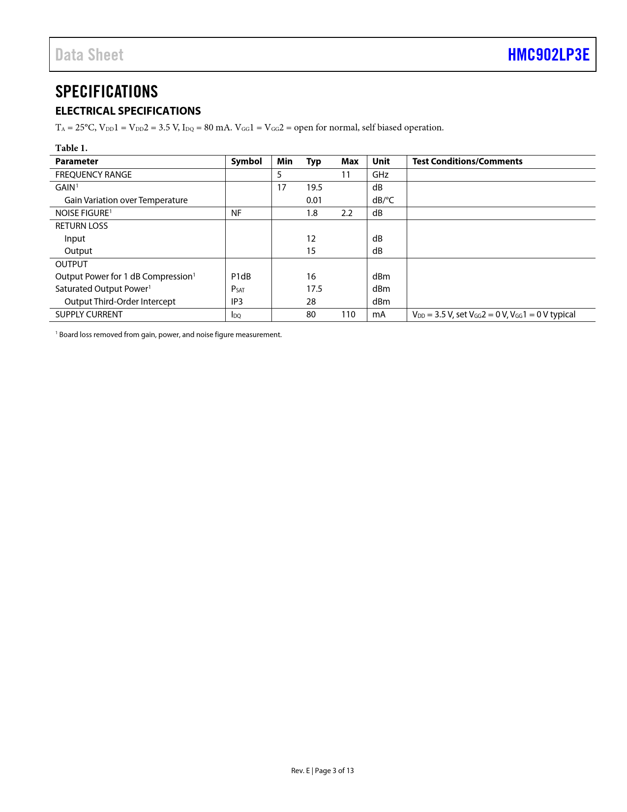 Data SheetHMC902LP3ESPECIFICATIONS ELECTRICAL SPECIFICATIONS TA = 25°C, VDD1 = VDD2 = 3.5 V, IDQ = 80 mA. VGG1 = VGG2 = open for normal, self biased operation. Table 1. ParameterSymbolMinTypMaxUnitTest Conditions/Comments FREQUENCY RANGE 5 11 GHz GAIN1 17 19.5 dB Gain Variation over Temperature 0.01 dB/°C NOISE FIGURE1 NF 1.8 2.2 dB RETURN LOSS Input 12 dB Output 15 dB OUTPUT Output Power for 1 dB Compression1 P1dB 16 dBm Saturated Output Power1 PSAT 17.5 dBm Output Third-Order Intercept IP3 28 dBm SUPPLY CURRENT IDQ 80 110 mA VDD = 3.5 V, set VGG2 = 0 V, VGG1 = 0 V typical 1 Board loss removed from gain, power, and noise figure measurement. Rev. E | Page 3 of 13 Document Outline FEATURES APPLICATIONS FUNCTIONAL BLOCK DIAGRAM GENERAL DESCRIPTION TABLE OF CONTENTS REVISION HISTORY SPECIFICATIONS ELECTRICAL SPECIFICATIONS ABSOLUTE MAXIMUM RATINGS ESD CAUTION PIN CONFIGURATION AND FUNCTION DESCRIPTIONS INTERFACE SCHEMATICS TYPICAL PERFORMANCE CHARACTERISTICS THEORY OF OPERATION APPLICATIONS INFORMATION EVALUATION PRINTED CIRCUIT BOARD (PCB) APPLICATION CIRCUITS OUTLINE DIMENSIONS ORDERING GUIDE
