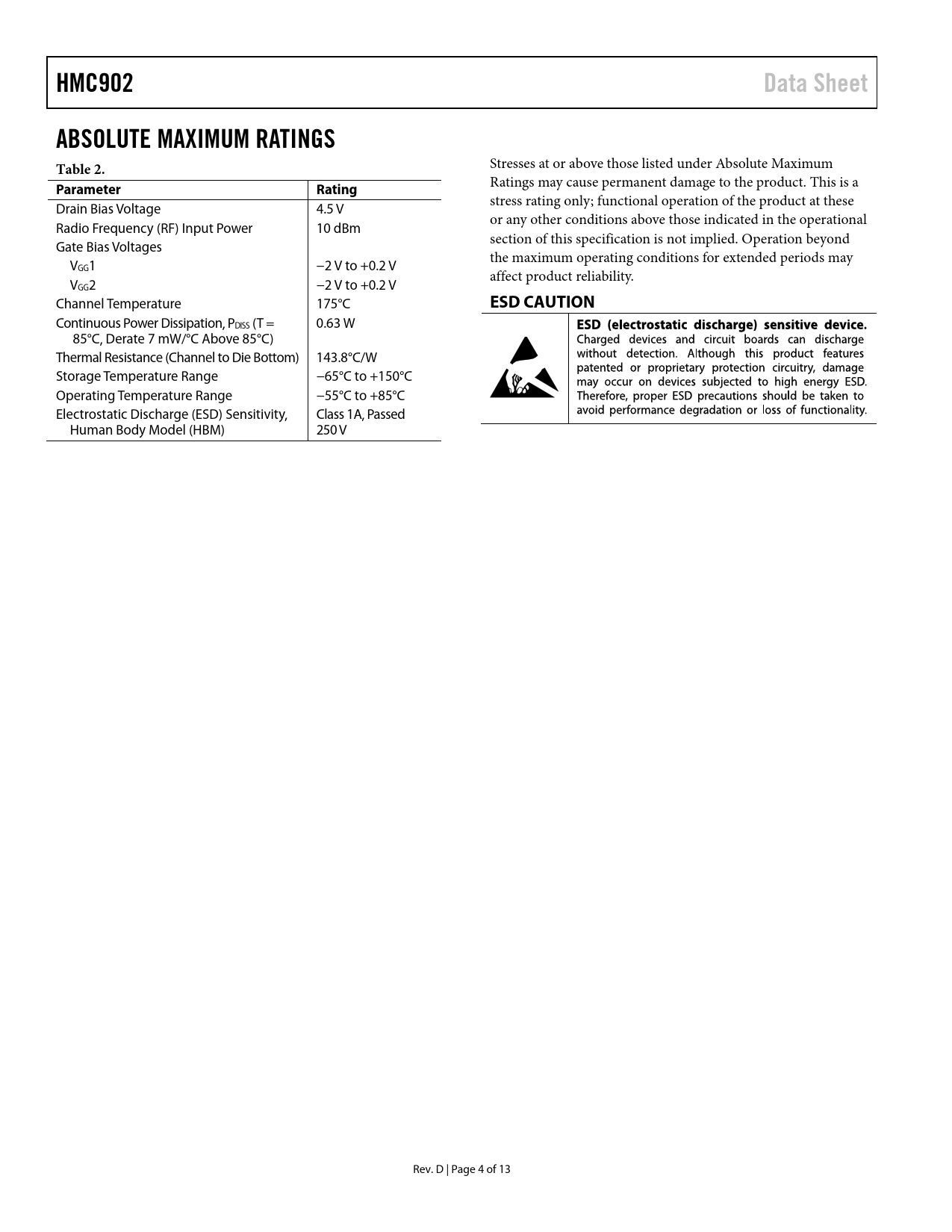 HMC902 Data Sheet ABSOLUTE MAXIMUM RATINGS Table 2 Parameter Rating ESD CAUTION