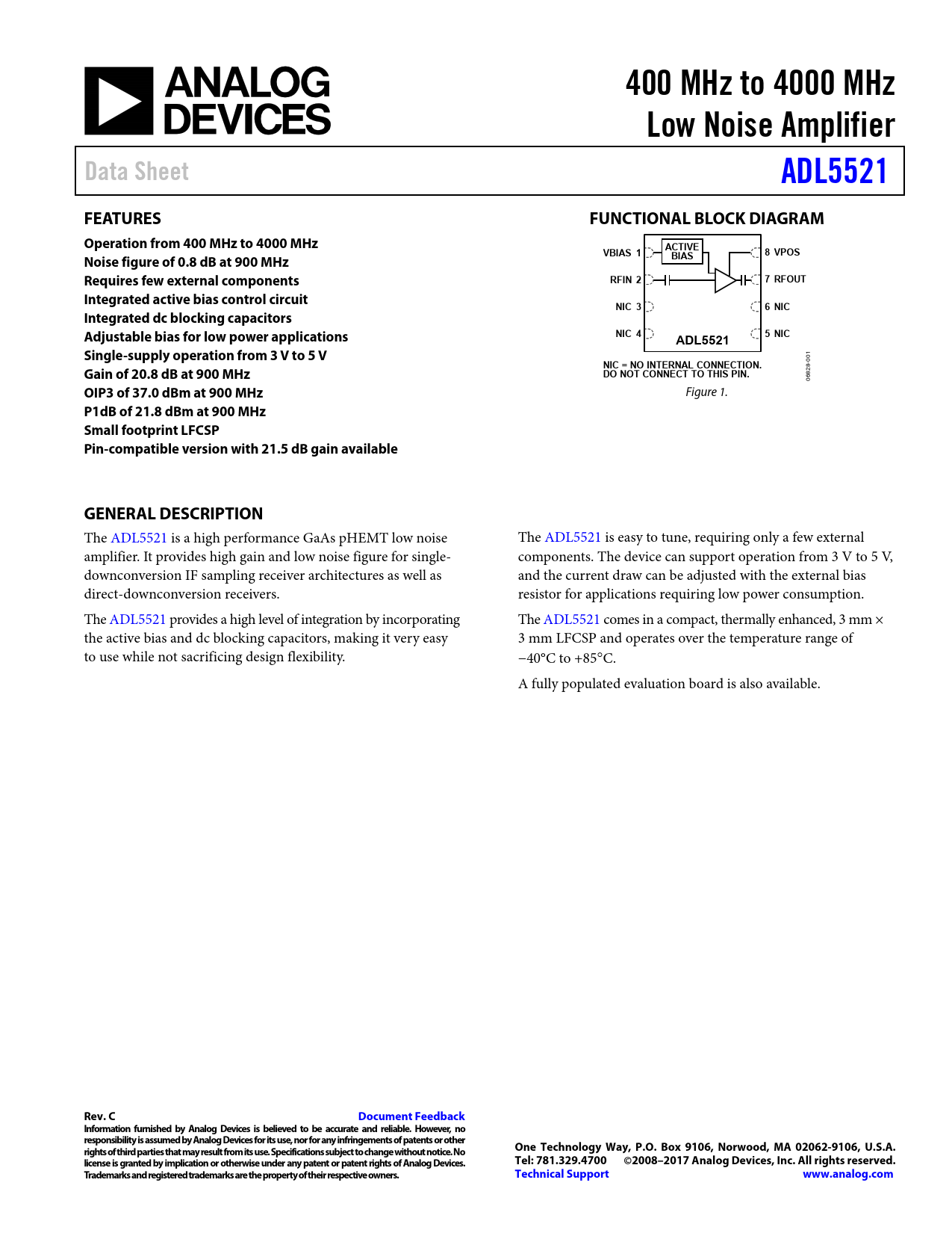 400 MHz to 4000 MHz. Low Noise Amplifier. Data Sheet. ADL5521. FEATURES. FUNCTIONAL BLOCK DIAGRAM