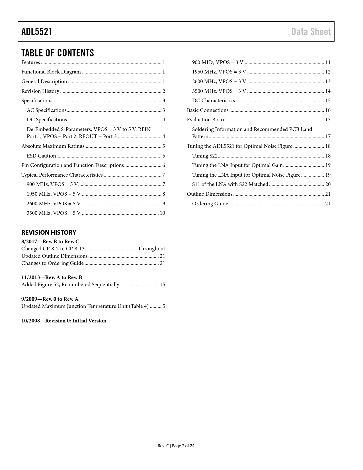 link to page 1 link to page 1 link to page 1 link to page 2 link to page 3 link to page 3 link to page 4 link to page 4 link to page 4 link to page 5 link to page 5 link to page 6 link to page 7 link to page 7 link to page 8 link to page 9 link to page 10 link to page 11 link to page 12 link to page 13 link to page 14 link to page 15 link to page 16 link to page 17 link to page 17 link to page 17 link to page 18 link to page 18 link to page 19 link to page 19 link to page 20 link to page 21 link to page 21 ADL5521Data SheetTABLE OF CONTENTS Features .. 1 900 MHz, VPOS = 3 V .. 11 Functional Block Diagram .. 1 1950 MHz, VPOS = 3 V .. 12 General Description ... 1 2600 MHz, VPOS = 3 V .. 13 Revision History ... 2 3500 MHz, VPOS = 3 V .. 14 Specifications ... 3 DC Characteristics ... 15 AC Specifications .. 3 Basic Connections .. 16 DC Specifications ... 4 Evaluation Board .. 17 De-Embedded S-Parameters, VPOS = 3 V to 5 V, RFIN = Soldering Information and Recommended PCB Land Port 1, VPOS = Port 2, RFOUT = Port 3 .. 4 Pattern .. 17 Absolute Maximum Ratings .. 5 Tuning the ADL5521 for Optimal Noise Figure .. 18 ESD Caution .. 5 Tuning S22 ... 18 Pin Configuration and Function Descriptions ... 6 Tuning the LNA Input for Optimal Gain .. 19 Typical Performance Characteristics ... 7 Tuning the LNA Input for Optimal Noise Figure .. 19 900 MHz, VPOS = 5 V ... 7 S11 of the LNA with S22 Matched ... 20 1950 MHz, VPOS = 5 V .. 8 Outline Dimensions ... 21 2600 MHz, VPOS = 5 V .. 9 Ordering Guide .. 21 3500 MHz, VPOS = 5 V .. 10 REVISION HISTORY 8/2017—Rev. B to Rev. C Changed CP-8-2 to CP-8-13 .. Throughout Updated Outline Dimensions ... 21 Changes to Ordering Guide .. 21 11/2013—Rev. A to Rev. B Added Figure 52, Renumbered Sequentially .. 15 9/2009—Rev. 0 to Rev. A Updated Maximum Junction Temperature Unit (Table 4) ... 5 10/2008—Revision 0: Initial Version Rev. C | Page 2 of 24 Document Outline FEATURES FUNCTIONAL BLOCK DIAGRAM GENERAL DESCRIPTION REVISION HISTORY SPECIFICATIONS AC SPECIFICATIONS DC SPECIFICATIONS DE-EMBEDDED S-PARAMETERS, VPOS = 3 V TO 5 V, RFIN = PORT 1, VPOS = PORT 2, RFOUT = PORT 3 ABSOLUTE MAXIMUM RATINGS ESD CAUTION PIN CONFIGURATION AND FUNCTION DESCRIPTIONS TYPICAL PERFORMANCE CHARACTERISTICS 900 MHz, VPOS = 5 V 1950 MHz, VPOS = 5 V 2600 MHZ, VPOS = 5 V 3500 MHz, VPOS = 5 V 900 MHz, VPOS = 3 V 1950 MHz, VPOS = 3 V 2600 MHZ, VPOS = 3 V 3500 MHZ, VPOS = 3 V DC CHARACTERISTICS BASIC CONNECTIONS EVALUATION BOARD SOLDERING INFORMATION AND RECOMMENDED PCB LAND PATTERN TUNING THE ADL5521 FOR OPTIMAL NOISE FIGURE TUNING S22 TUNING THE LNA INPUT FOR OPTIMAL GAIN TUNING THE LNA INPUT FOR OPTIMAL NOISE FIGURE S11 OF THE LNA WITH S22 MATCHED OUTLINE DIMENSIONS ORDERING GUIDE