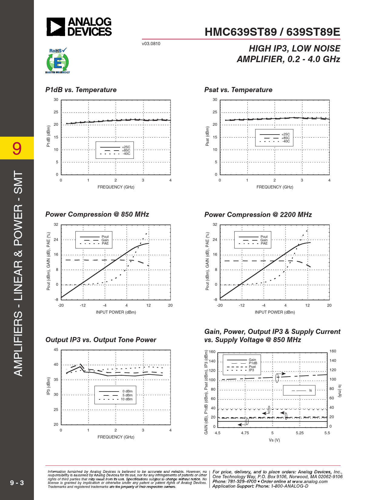 HMC639ST89 / 639ST89E v03.0810 HIGH IP3, LOW NOISEAMPLIFIER, 0.2 - 4.0 GHzP1dB vs. TemperaturePsat vs. Temperature 30 30 25 25 20 20 (dBm) +25C (dBm) 15 15 +85C 9 -40C P1dB Psat +25C 10 +85C 10 -40C 5 5 T 0 0 M 0 1 2 3 4 0 1 2 3 4 FREQUENCY (GHz) FREQUENCY (GHz) R - S E Power Compression @ 850 MHzPower Compression @ 2200 MHz W 32 32 O ) Pout Pout (% (% 24 E Gain 24 E Gain A PAE A PAE ), P ), P 16 16 (dB (dB R & P IN IN A A A ), G 8 ), G 8 E m m IN 0 0 out (dB out (dB P P -8 -8 -20 -12 -4 4 12 20 -20 -12 -4 4 12 20 S - L INPUT POWER (dBm) INPUT POWER (dBm) R IE Gain, Power, Output IP3 & Supply CurrentOutput IP3 vs. Output Tone Powervs. Supply Voltage @ 850 MHz LIF P 45 160 160 M (dBm) 140 Gain 140 40 P1dB A IP3 Psat 120 IP3 120 ) 35 (dBm), 100 100 I (dBm s 80 80 (m 0 dBm Is IP3 ), Psat A 30 5 dBm m ) 10 dBm 60 60 (dB 25 40 40 1dB ), P 20 20 20 (dB IN 0 0 0 1 2 3 4 A G 4.5 4.75 5 5.25 5.5 FREQUENCY (GHz) Vs (V) Inf F or o m rat ip o r n ifc ur e n ,is hd e e d lbiv y e Anry alo a g n D d evi cto es ips la beclie ev eo d rtd o e b r e sa: ccH ur iattte itaen M d reliic a r bl o e w . H a o v weev eC r, o n r o For price, delivery, and to place orders: Analog Devices, Inc., responsibility is assumed by Analog Devices for its use, nor for any infringements of patents or other poration, 20 Alpha Road, Chelmsford, MA 01824 One Technology Way, P.O. Box 9106, Norwood, MA 02062-9106 Phone: 978-250-3343 Fax: 978-250-3373 rights of third parties that may result from its use. Specifications subject to change without notice. No Or P d hoe n r e O : 7 n- 81-li 3 n 2 e 9- a 4 t 7 0 www 0 • O . rdh e itt r o it n e li . n co e a m 9 - 3 license is granted by implication or otherwise under any patent or patent rights of Analog Devices. t www.analog.com Application Support: Phon Trademarks and registered trademarks are the property of their respective owners. e: 978-250-334 A 3 p p liocra t ia o pp n S s u @ p h por ittti : Pte. ho c n o e m : 1-800-ANALOG-D