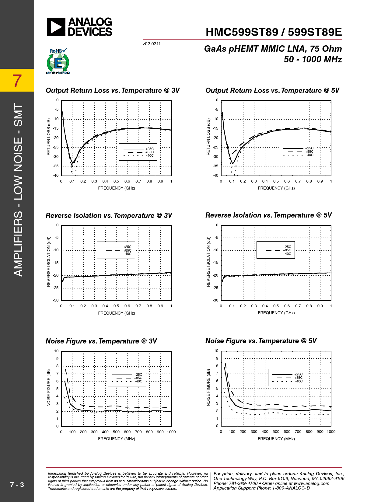 r 0 0 ie ) -5 ) -5 lif (dB (dB N +25C N +25C p -10 +85C -10 +85C IO IO T -40C T -40C LA LA m O O -15 -15 A IS IS E E S S R -20 R -20 E E V V E E R R -25 -25 -30 -30 0 0.1 0.2 0.3 0.4 0.5 0.6 0.7 0.8 0.9 1 0 0.1 0.2 0.3 0.4 0.5 0.6 0.7 0.8 0.9 1 FREQUENCY (GHz) FREQUENCY (GHz)