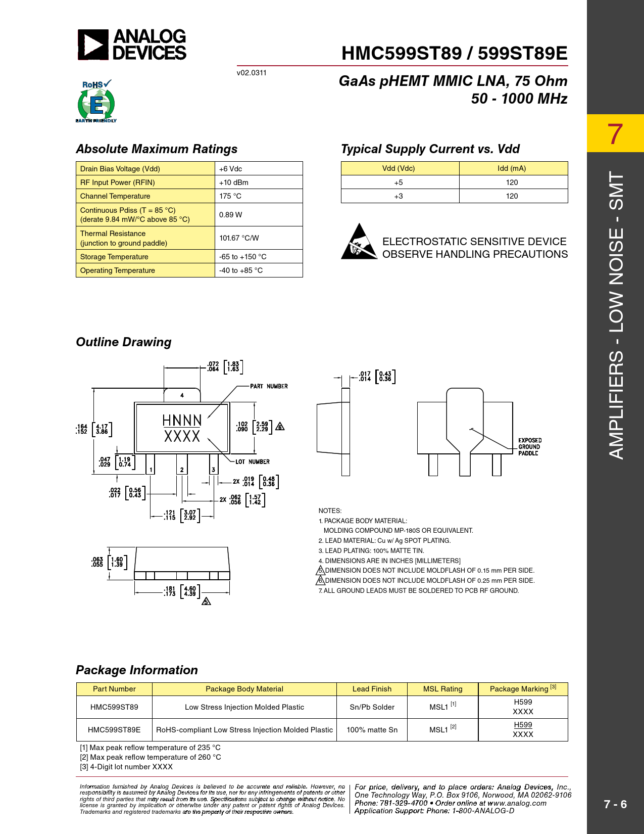 HMC599ST89 / 599ST89E v02.0311 GaAs pHEMT MMIC LNA, 75 Ohm50 - 1000 MHz 7 Absolute Maximum RatingsTypical Supply Current vs. Vdd Drain Bias Voltage (Vdd) +6 Vdc Vdd (Vdc) idd (mA) rf input power (rfiN) +10 dBm +5 120 T Channel Temperature 175 °C +3 120 m Continuous pdiss (T = 85 °C) s 0.89 w (derate 9.84 mw/°C above 85 °C) Thermal resistance 101.67 °C/w e - (junction to ground paddle) ELECTROSTATIC SENSITIVE DEVICE storage Temperature -65 to +150 °C OBSERVE HANDLING PRECAUTIONS is operating Temperature -40 to +85 °C o w N lo Outline Drawing s - r ie lif p m A NoTes: 1. PACKAGE BODY MATERIAL: MOLDING COMPOUND MP-180S OR EQUIVALENT. 2. LEAD MATERIAL: Cu w/ Ag SPOT PLATING. 3. LEAD PLATING: 100% MATTE TIN. 4. DIMENSIONS ARE IN INCHES [MILLIMETERS] 5. DIMENSION DOES NOT INCLUDE MOLDFLASH OF 0.15 mm PER SIDE. 6. DIMENSION DOES NOT INCLUDE MOLDFLASH OF 0.25 mm PER SIDE. 7. ALL GROUND LEADS MUST BE SOLDERED TO PCB RF GROUND. Package Information part Number package Body material lead finish msl rating package marking [3] HmC599sT89 low stress injection molded plastic sn/pb solder msl1 [1] H599 XXXX HmC599sT89e roHs-compliant low stress injection molded plastic 100% matte sn msl1 [2] H599 XXXX [1] max peak reflow temperature of 235 °C [2] max peak reflow temperature of 260 °C [3] 4-Digit lot number XXXX Inf F or o m rat ip o r n ifc ur e n ,is hd e e d lbiv y e Anry alo a g n D d evi cto es ips la beclie ev eo d rtd o e b r e sa: ccH ur iattte itaen M d reliic a r bl o e w . H a o v weev eC r, o n r o For price, delivery, and to place orders: Analog Devices, Inc., responsibility is assumed by Analog Devices for its use, nor for any infringements of patents or other poration, 20 Alpha Road, Chelmsford, MA 01824 One Technology Way, P.O. Box 9106, Norwood, MA 02062-9106 Phone: 978-250-3343 Fax: 978-250-3373 rights of third parties that may result from its use. Specifications subject to change without notice. No Or P d hoe n r e O : 7 n- 81-li 3 n 2 e 9- a 4 t 7 0 www 0 • O . rdh e itt r o it n e li . n co e a m license is granted by implication or otherwise under any patent or patent rights of Analog Devices. t www.analog.com 7 - 6 Application Support: Phon Trademarks and registered trademarks are the property of their respective owners. e: 978-250-334 A 3 p p liocra t ia o pp n S s u @ p h por ittti : Pte. ho c n o e m : 1-800-ANALOG-D