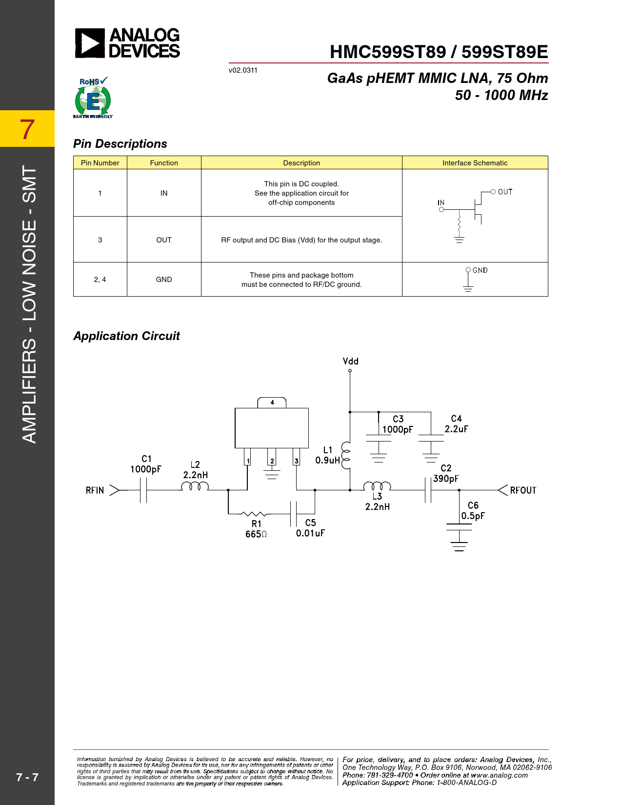 HMC599ST89 / 599ST89E. GaAs pHEMT MMIC LNA, 75 Ohm. 50 - 1000 MHz. Pin Descriptions. Application Circuit. 7 - 7