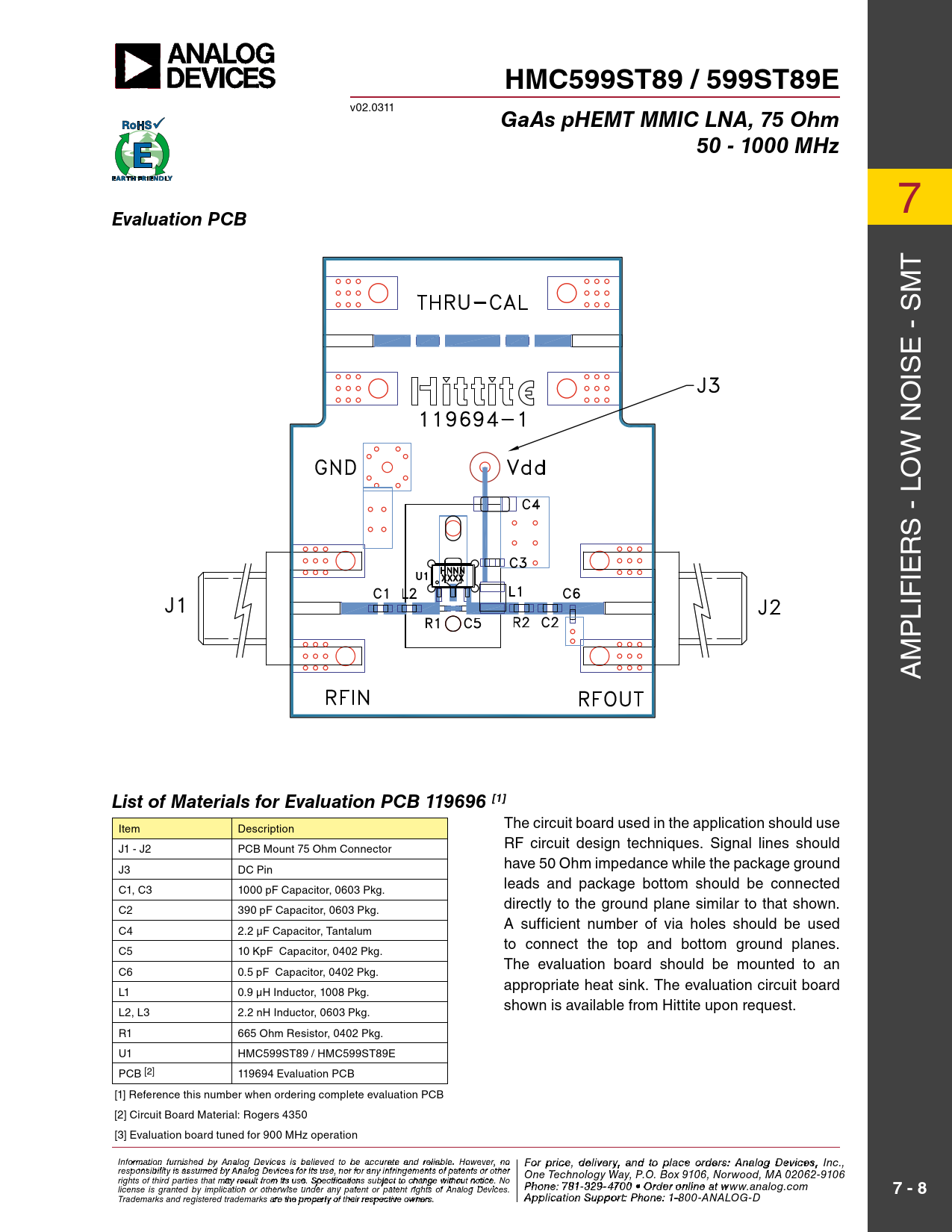 HMC599ST89 / 599ST89E v02.0311 GaAs pHEMT MMIC LNA, 75 Ohm50 - 1000 MHz 7 Evaluation PCB T m s e - is o w N lo s - r ie lif p m A List of Materials for Evaluation PCB 119696 [1] The circuit board used in the application should use item Description rf circuit design techniques. signal lines should J1 - J2 pCB mount 75 ohm Connector have 50 ohm impedance while the package ground J3 DC Pin leads and package bottom should be connected C1, C3 1000 pf Capacitor, 0603 pkg. directly to the ground plane similar to that shown. C2 390 pf Capacitor, 0603 pkg. A sufficient number of via holes should be used C4 2.2 µf Capacitor, Tantalum to connect the top and bottom ground planes. C5 10 Kpf Capacitor, 0402 pkg. The evaluation board should be mounted to an C6 0.5 pf Capacitor, 0402 pkg. appropriate heat sink. The evaluation circuit board l1 0.9 μH inductor, 1008 pkg. shown is available from Hittite upon request. l2, l3 2.2 nH inductor, 0603 pkg. r1 665 ohm resistor, 0402 pkg. U1 HmC599sT89 / HmC599sT89e pCB [2] 119694 evaluation pCB [1] reference this number when ordering complete evaluation pCB [2] Circuit Board material: rogers 4350 [3] evaluation board tuned for 900 mHz operation Inf F or o m rat ip o r n ifc ur e n ,is hd e e d lbiv y e Anry alo a g n D d evi cto es ips la beclie ev eo d rtd o e b r e sa: ccH ur iattte itaen M d reliic a r bl o e w . H a o v weev eC r, o n r o For price, delivery, and to place orders: Analog Devices, Inc., responsibility is assumed by Analog Devices for its use, nor for any infringements of patents or other poration, 20 Alpha Road, Chelmsford, MA 01824 One Technology Way, P.O. Box 9106, Norwood, MA 02062-9106 Phone: 978-250-3343 Fax: 978-250-3373 rights of third parties that may result from its use. Specifications subject to change without notice. No Or P d hoe n r e O : 7 n- 81-li 3 n 2 e 9- a 4 t 7 0 www 0 • O . rdh e itt r o it n e li . n co e a m license is granted by implication or otherwise under any patent or patent rights of Analog Devices. t www.analog.com 7 - 8 Application Support: Phon Trademarks and registered trademarks are the property of their respective owners. e: 978-250-334 A 3 p p liocra t ia o pp n S s u @ p h por ittti : Pte. ho c n o e m : 1-800-ANALOG-D