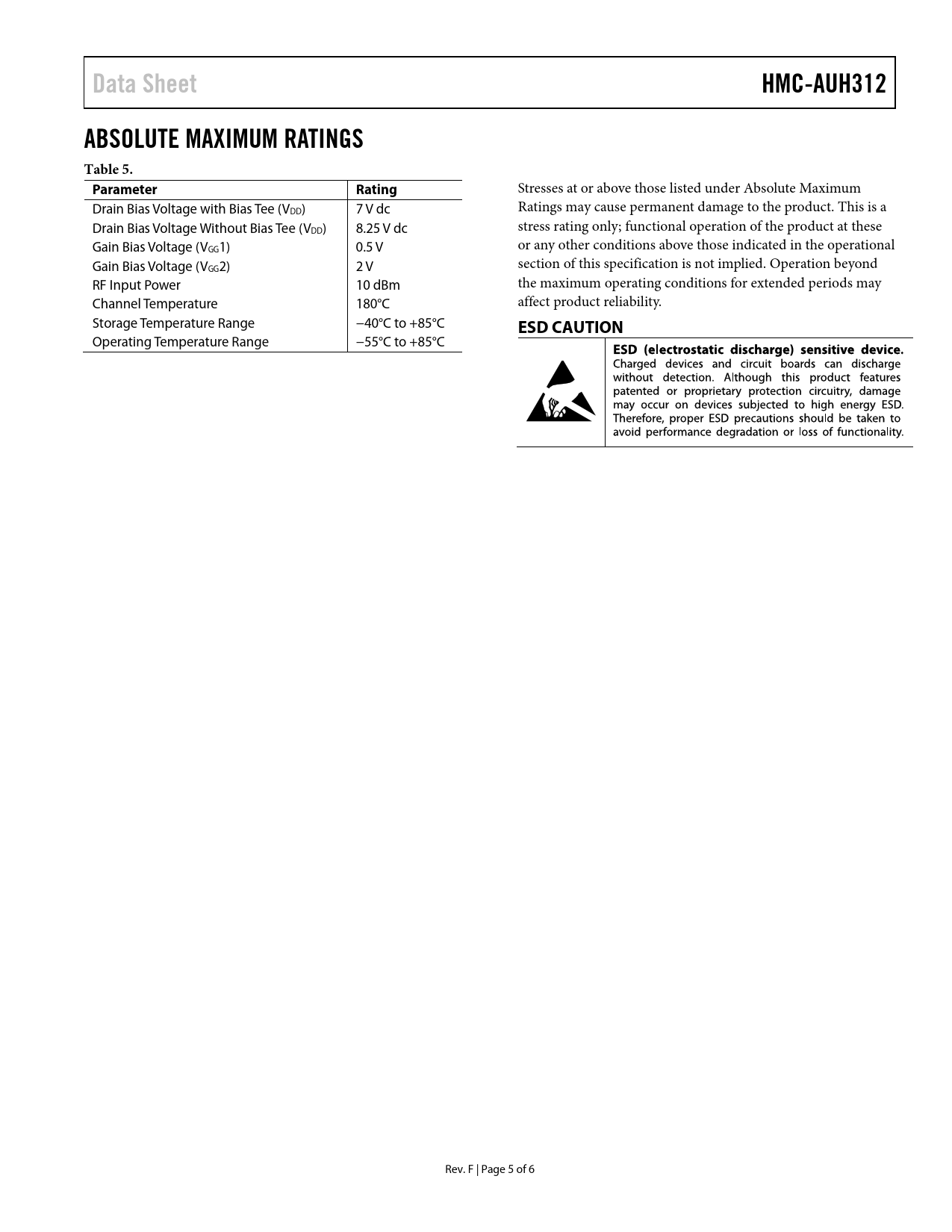 Data Sheet HMC-AUH312 ABSOLUTE MAXIMUM RATINGS Table 5 Parameter Rating ESD CAUTION