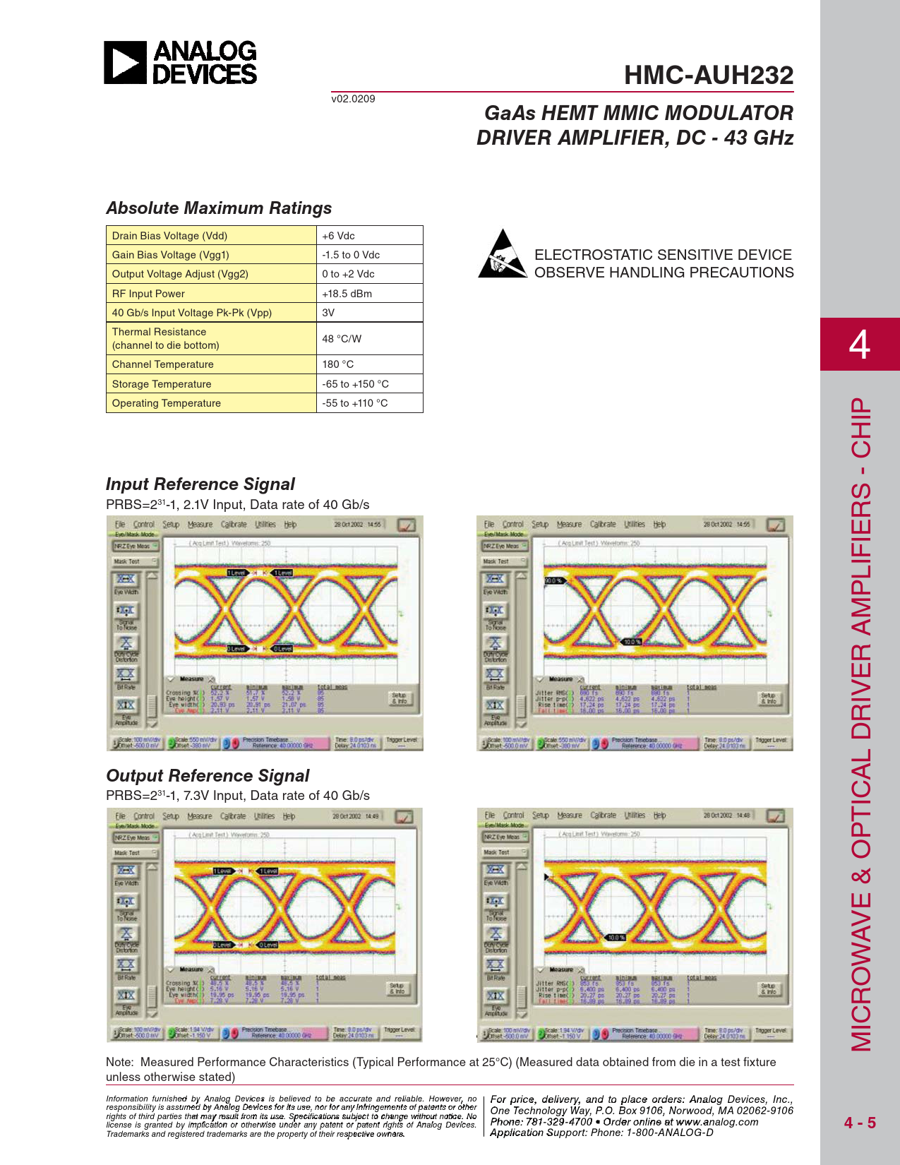 HMC-AUH232 v02.0209 GaAs HEMT MMIC MODULATORDRIVER AMPLIFIER, DC - 43 GHzAbsolute Maximum Ratings Drain Bias Voltage (Vdd) +6 Vdc Gain Bias Voltage (Vgg1) -1.5 to 0 Vdc ELECTROSTATIC SENSITIVE DEVICE Output Voltage Adjust (Vgg2) 0 to +2 Vdc OBSERVE HANDLING PRECAUTIONS RF Input Power +18.5 dBm 40 Gb/s Input Voltage Pk-Pk (Vpp) 3V Thermal Resistance 48 °C/W (channel to die bottom) 4 Channel Temperature 180 °C Storage Temperature -65 to +150 °C Operating Temperature -55 to +110 °C IP H Input Reference Signal S - C PRBS=231-1, 2.1V Input, Data rate of 40 Gb/s R IE IF L P M R A E IV R L D Output Reference Signal A PRBS=231-1, 7.3V Input, Data rate of 40 Gb/s IC T P E & O V A W O R IC M Note: Measured Performance Characteristics (Typical Performance at 25°C) (Measured data obtained from die in a test fi xture unless otherwise stated) Information furnish F e o d r pri by An ce, de alog Devic leis vie s rby eli, a eve nd to pla d to be accur ce o ate an r d der relia s ble , pl . Ho ease co wever, no For price, delivery, and to place orders: Analog Devices, Inc., responsibility is assumed by Analog Devices for its use, nor for any infringements of patents or other ntact Hittite Microwave Corporation: One Technology Way, P.O. Box 9106, Norwood, MA 02062-9106 20 Alpha Road, Chelmsford, MA 01824 Phone rights of third parties that may result from its use. Specifications subject to change without notice. No : 978 Phon -e25 : 7 0 81 - - 3 3 3 29 4 - 3 F 470 ax 0 • O : 978 rder o - nl 25 in 0 e a - t 33 ww 73 license is granted by implication or otherwise under any patent or patent rights of Analog Devices. w.analog.com 4 - 5 Order On- Trademarks and registered trademarks are the property of their respective owners. line at www.hi A tptipte.co licatio m n Support: Phone: 1-800-ANALOG-D