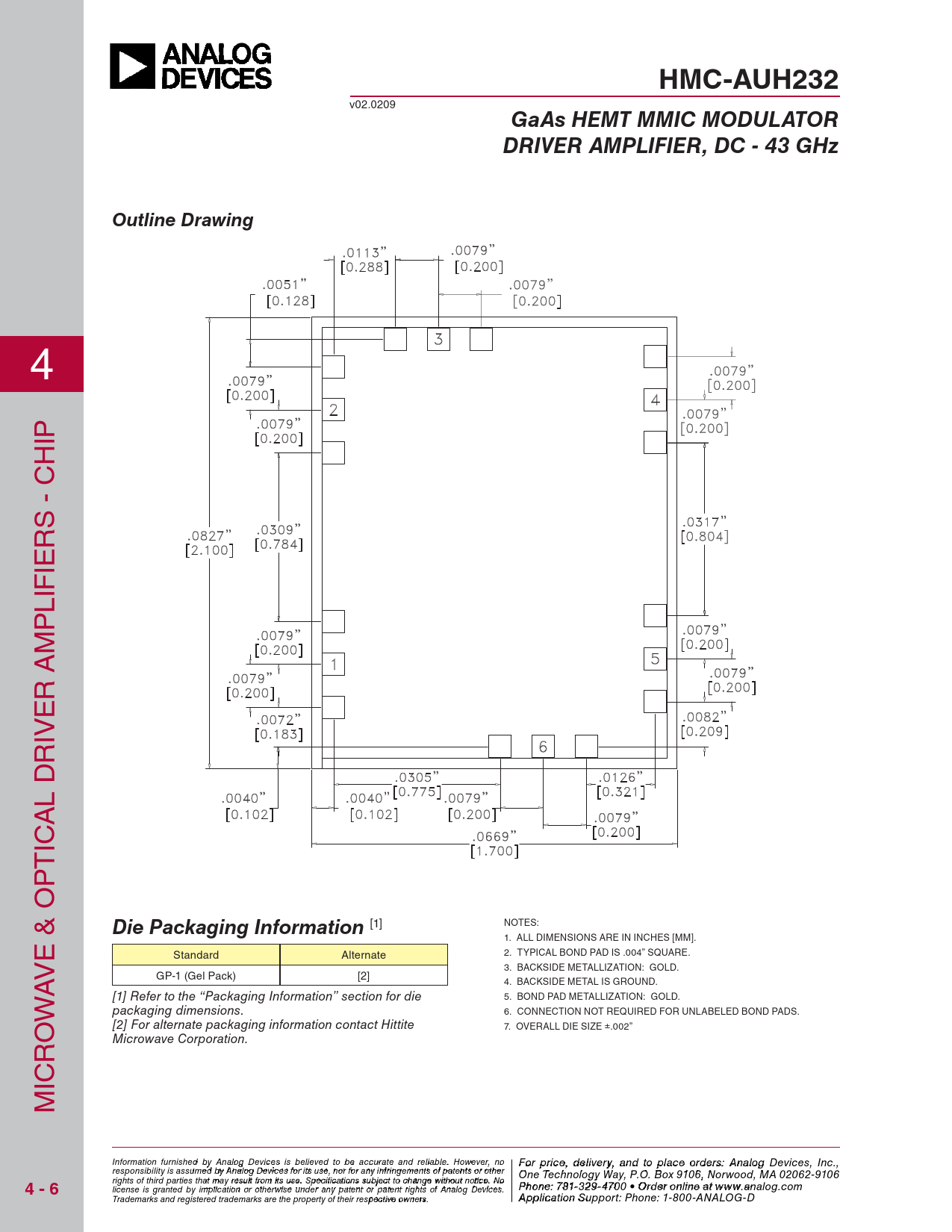 HMC-AUH232. GaAs HEMT MMIC MODULATOR. DRIVER AMPLIFIER, DC - 43 GHz. Outline Drawing. Die Packaging Information. 4 - 6