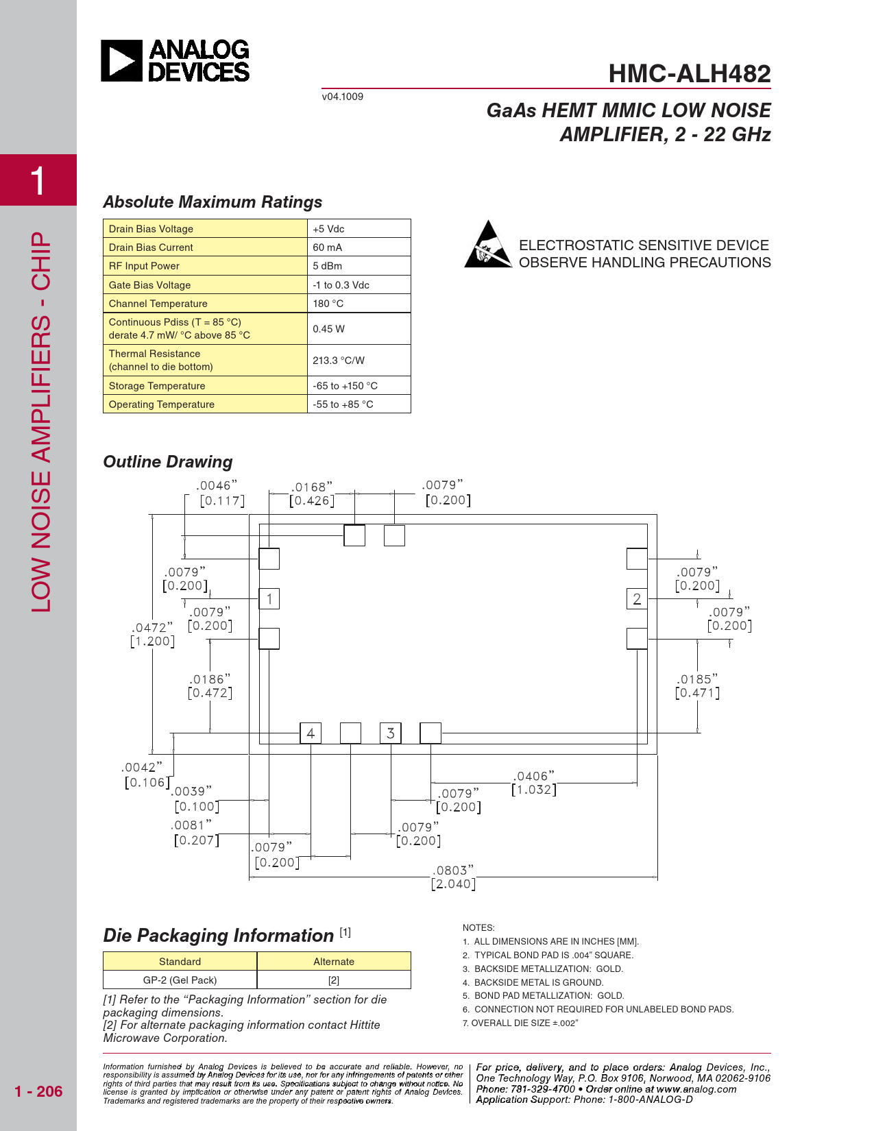 HMC-ALH482 GaAs HEMT MMIC LOW NOISE AMPLIFIER, 2 - 22 GHz Absolute Maximum Ratings Outline Drawing Die Packaging Information