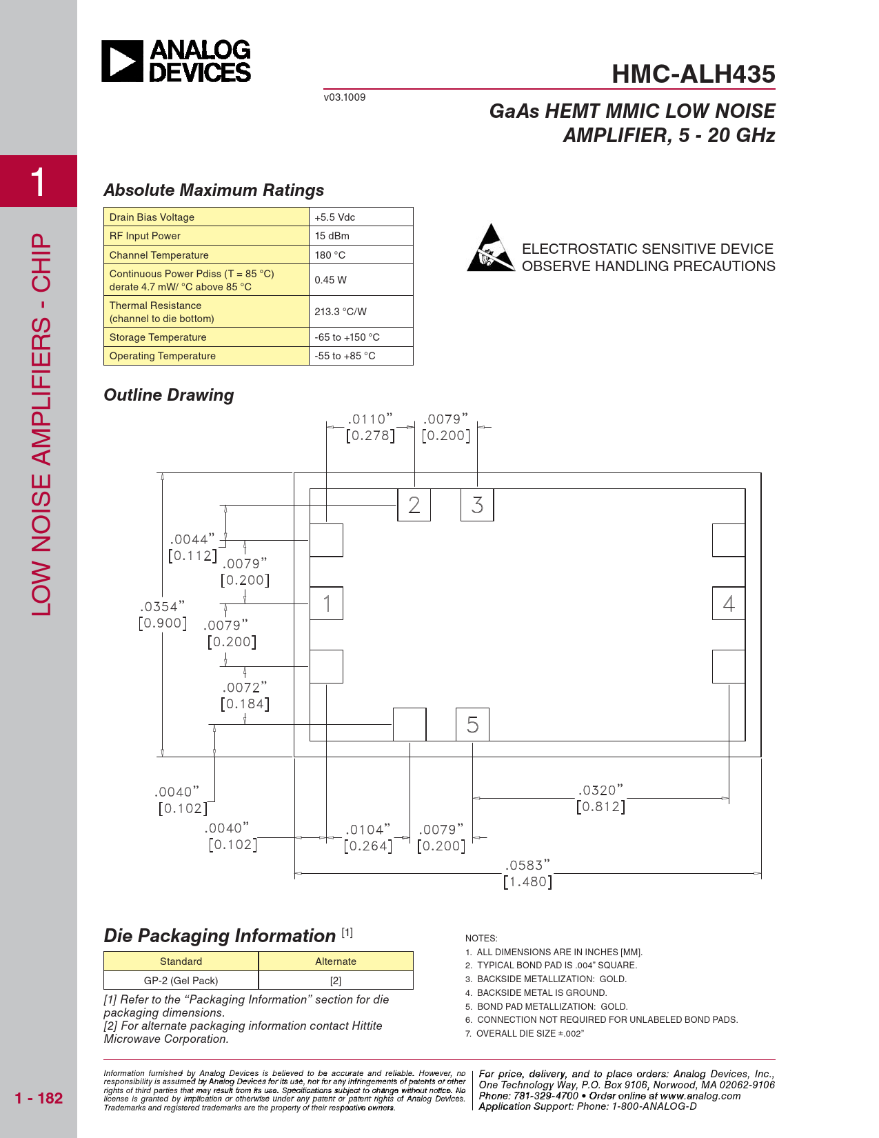 HMC-ALH435 v03.1009 GaAs HEMT MMIC LOW NOISEAMPLIFIER, 5 - 20 GHz 1 Absolute Maximum Ratings Drain Bias Voltage +5.5 Vdc RF Input Power 15 dBm IP ELECTROSTATIC SENSITIVE DEVICE Channel Temperature 180 °C H OBSERVE HANDLING PRECAUTIONS Continuous Power Pdiss (T = 85 °C) 0.45 W C derate 4.7 mW/ °C above 85 °C - Thermal Resistance 213.3 °C/W (channel to die bottom) RS Storage Temperature -65 to +150 °C IE Operating Temperature -55 to +85 °C IF L Outline Drawing P M A E IS O N W O L NOTES: Die Packaging Information [1] 1. ALL DIMENSIONS ARE IN INCHES [MM]. Standard Alternate 2. TYPICAL BOND PAD IS .004” SQUARE. 3. BACKSIDE METALLIZATION: GOLD. GP-2 (Gel Pack) [2] 4. BACKSIDE METAL IS GROUND. [1] Refer to the “Packaging Information” section for die 5. BOND PAD METALLIZATION: GOLD. packaging dimensions. 6. CONNECTION NOT REQUIRED FOR UNLABELED BOND PADS. [2] For alternate packaging information contact Hittite 7. OVERALL DIE SIZE ±.002” Microwave Corporation. Information furnish F ed obr pri y Anal ce, de og Device li s vie s r beyli, a eve nd to pla d to be accura ce o te and rder reliabl s e , pl . Ho ease co wever, no For price, delivery, and to place orders: Analog Devices, Inc., responsibility is assumed by Analog Devices for its use, nor for any infringements of patents or other ntact Hittite Microwave Corporation: One Technology Way, P.O. Box 9106, Norwood, MA 02062-9106 rights of third parties that may result from its use. Specifications subject to change without notice. No 1 - 182 20 Alpha Road, Chelmsford, MA 01824 Phone: 978 Phon - e 25 : 7 0 81--3 32 3 9 4 - 3 F 70 ax 0 • O : 978 rder on -li25 n 0 e a - t 33 ww 73 license is granted by implication or otherwise under any patent or patent rights of Analog Devices. w.analog.com Order On Trademarks and registered trademarks are the property of their respective owners. -line at www.h A it p tpite.co licatio m n Support: Phone: 1-800-ANALOG-D