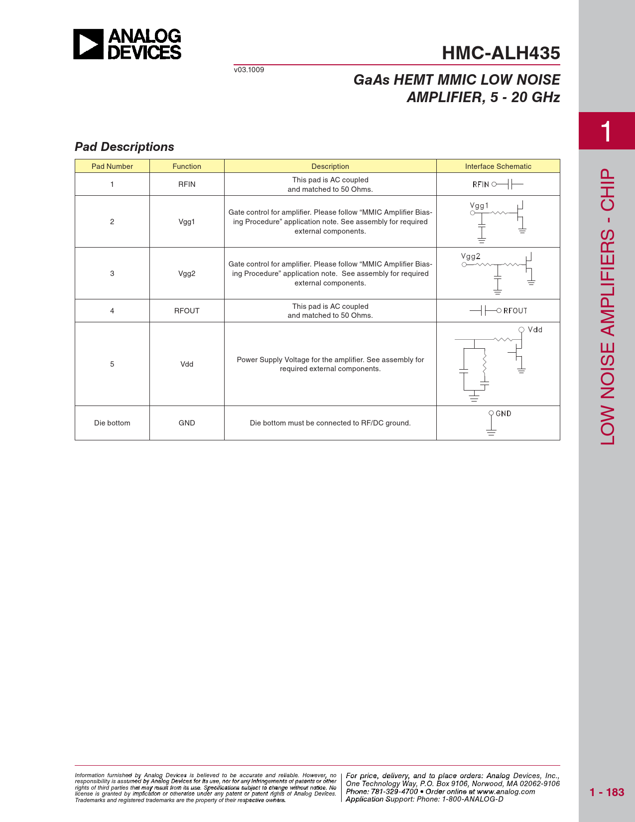 HMC-ALH435. GaAs HEMT MMIC LOW NOISE. AMPLIFIER, 5 - 20 GHz. Pad Descriptions. 1 - 183