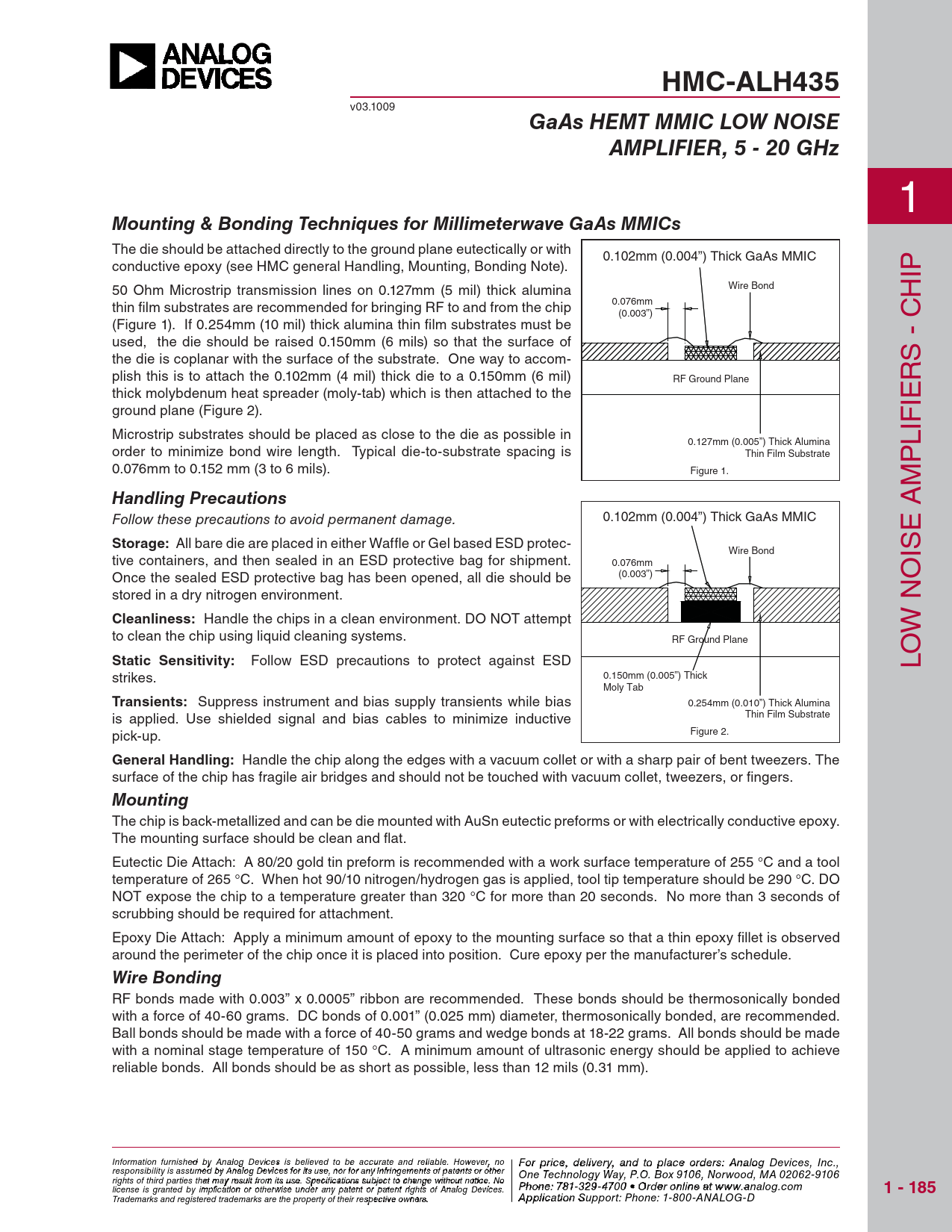HMC-ALH435 v03.1009 GaAs HEMT MMIC LOW NOISEAMPLIFIER, 5 - 20 GHz 1 Mounting & Bonding Techniques for Millimeterwave GaAs MMICs The die should be attached directly to the ground plane eutectically or with 0.102mm (0.004”) Thick GaAs MMIC conductive epoxy (see HMC general Handling, Mounting, Bonding Note). IP 50 Ohm Microstrip transmission lines on 0.127mm (5 mil) thick alumina Wire Bond H 0.076mm thin fi lm substrates are recommended for bringing RF to and from the chip (0.003”) (Figure 1). If 0.254mm (10 mil) thick alumina thin fi lm substrates must be C used, the die should be raised 0.150mm (6 mils) so that the surface of - the die is coplanar with the surface of the substrate. One way to accom- plish this is to attach the 0.102mm (4 mil) thick die to a 0.150mm (6 mil) RF Ground Plane RS thick molybdenum heat spreader (moly-tab) which is then attached to the IE ground plane (Figure 2). IF Microstrip substrates should be placed as close to the die as possible in 0.127mm (0.005”) Thick Alumina L order to minimize bond wire length. Typical die-to-substrate spacing is Thin Film Substrate P 0.076mm to 0.152 mm (3 to 6 mils). Figure 1. M Handling Precautions A Follow these precautions to avoid permanent damage. 0.102mm (0.004”) Thick GaAs MMIC E Storage: All bare die are placed in either Waffle or Gel based ESD protec- Wire Bond IS tive containers, and then sealed in an ESD protective bag for shipment. 0.076mm Once the sealed ESD protective bag has been opened, all die should be (0.003”) O stored in a dry nitrogen environment. N Cleanliness: Handle the chips in a clean environment. DO NOT attempt W to clean the chip using liquid cleaning systems. RF Ground Plane O Static Sensitivity: Follow ESD precautions to protect against ESD L strikes. 0.150mm (0.005”) Thick Moly Tab Transients: Suppress instrument and bias supply transients while bias 0.254mm (0.010”) Thick Alumina is applied. Use shielded signal and bias cables to minimize inductive Thin Film Substrate pick-up. Figure 2. General Handling: Handle the chip along the edges with a vacuum collet or with a sharp pair of bent tweezers. The surface of the chip has fragile air bridges and should not be touched with vacuum collet, tweezers, or fi ngers. Mounting The chip is back-metallized and can be die mounted with AuSn eutectic preforms or with electrically conductive epoxy. The mounting surface should be clean and fl at. Eutectic Die Attach: A 80/20 gold tin preform is recommended with a work surface temperature of 255 °C and a tool temperature of 265 °C. When hot 90/10 nitrogen/hydrogen gas is applied, tool tip temperature should be 290 °C. DO NOT expose the chip to a temperature greater than 320 °C for more than 20 seconds. No more than 3 seconds of scrubbing should be required for attachment. Epoxy Die Attach: Apply a minimum amount of epoxy to the mounting surface so that a thin epoxy fi llet is observed around the perimeter of the chip once it is placed into position. Cure epoxy per the manufacturer’s schedule. Wire Bonding RF bonds made with 0.003” x 0.0005” ribbon are recommended. These bonds should be thermosonically bonded with a force of 40-60 grams. DC bonds of 0.001” (0.025 mm) diameter, thermosonically bonded, are recommended. Ball bonds should be made with a force of 40-50 grams and wedge bonds at 18-22 grams. All bonds should be made with a nominal stage temperature of 150 °C. A minimum amount of ultrasonic energy should be applied to achieve reliable bonds. All bonds should be as short as possible, less than 12 mils (0.31 mm). Information furnish F e o d r pri by An ce, de alog Devic leis vie s rby eli, a eve nd to pla d to be accur ce o ate an r d der relia s ble , pl . Ho ease co wever, no For price, delivery, and to place orders: Analog Devices, Inc., responsibility is assumed by Analog Devices for its use, nor for any infringements of patents or other ntact Hittite Microwave Corporation: One Technology Way, P.O. Box 9106, Norwood, MA 02062-9106 20 Alpha Road, Chelmsford, MA 01824 Phone rights of third parties that may result from its use. Specifications subject to change without notice. No : 978 Phon -e25 : 7 0 81 - - 3 3 3 29 4 - 3 F 470 ax 0 • O : 978 rder o - nl 25 in 0 e a - t 33 ww 73 license is granted by implication or otherwise under any patent or patent rights of Analog Devices. w.analog.com 1 - 185 Order On- Trademarks and registered trademarks are the property of their respective owners. line at www.hi A tptipte.co licatio m n Support: Phone: 1-800-ANALOG-D