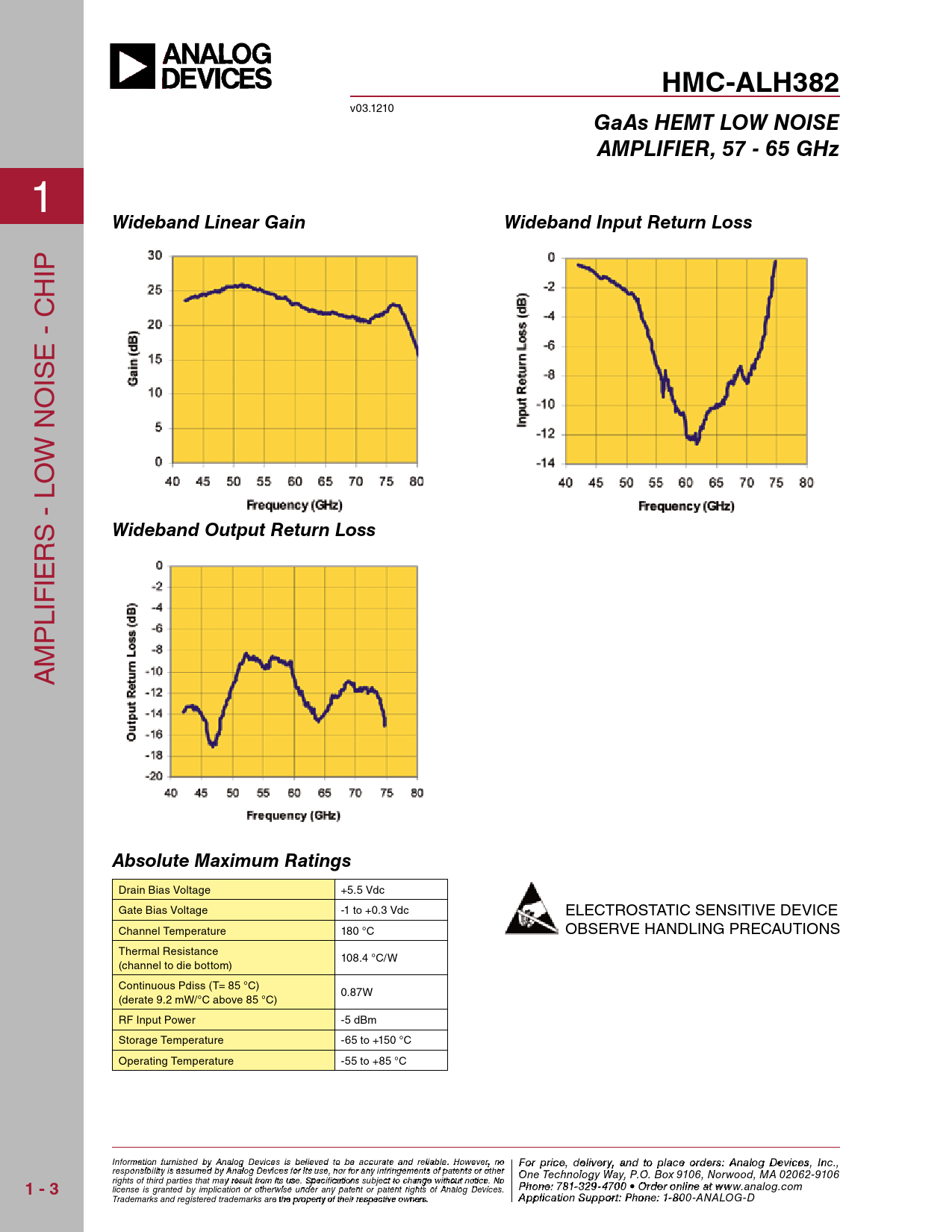 HMC-ALH382 v03.1210 GaAs HEMT LOW NOISEAMPLIFIER, 57 - 65 GHz 1 Wideband Linear GainWideband Input Return Loss ip h e - C is o w n o s - l Wideband Output Return Loss r ie lif p m A Absolute Maximum Ratings Drain Bias Voltage +5.5 Vdc Gate Bias Voltage -1 to +0.3 Vdc eleCTrosTATiC sensiTiVe DeViCe Channel Temperature 180 °C oBserVe hAnDlinG preCAUTions Thermal resistance 108.4 °C/w (channel to die bottom) Continuous pdiss (T= 85 °C) 0.87w (derate 9.2 mw/°C above 85 °C) rf input power -5 dBm storage Temperature -65 to +150 °C operating Temperature -55 to +85 °C Infor F m o ati ro p n f ruirc n e ish ,e d d e b l y iv Anealroyg a D n evidc ets oi s pblealic ev e e d otr o d b e e ras cc: urH at it e taitne d M relia ic bler. ow Ho a we vve er , C n o o For price, delivery, and to place orders: Analog Devices, Inc., responsibility is assumed by Analog Devices for its use, nor for any infringements of patents or other rporation, 20 Alpha Road, Chelmsford, MA 01824 One Technology Way, P.O. Box 9106, Norwood, MA 02062-9106 1 - 3 Phone: 978-250-3343 Fax: 978-250-3373 rights of third parties that may result from its use. Specifications subject to change without notice. No O Ph rod n e e r : 7On 81- - 3 li 2 n 9-e 4 a 70t ww 0 • O w rd . e hi r ott nliite n .c e a o t m license is granted by implication or otherwise under any patent or patent rights of Analog Devices. www.analog.com Application Support: Pho Trademarks and registered trademarks are the property of their respective owners. ne: 978-250-33 A 4 p 3 pli co atri o ap n S p ups@ por h t it : Ptit hoen.c e o : 1 m -800-ANALOG-D