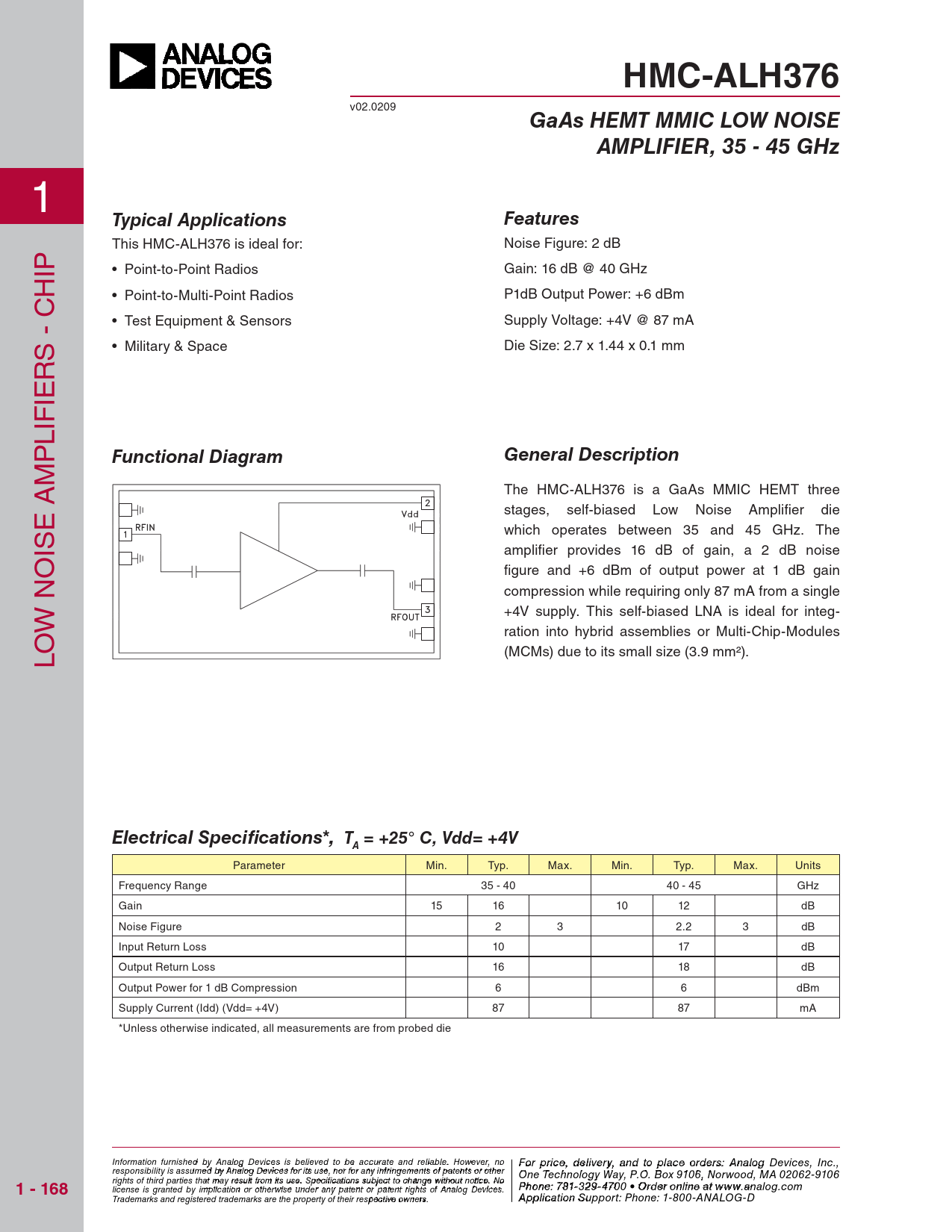 HMC-ALH376. GaAs HEMT MMIC LOW NOISE. AMPLIFIER, 35 - 45 GHz. Typical Applications. Features. Functional Diagram