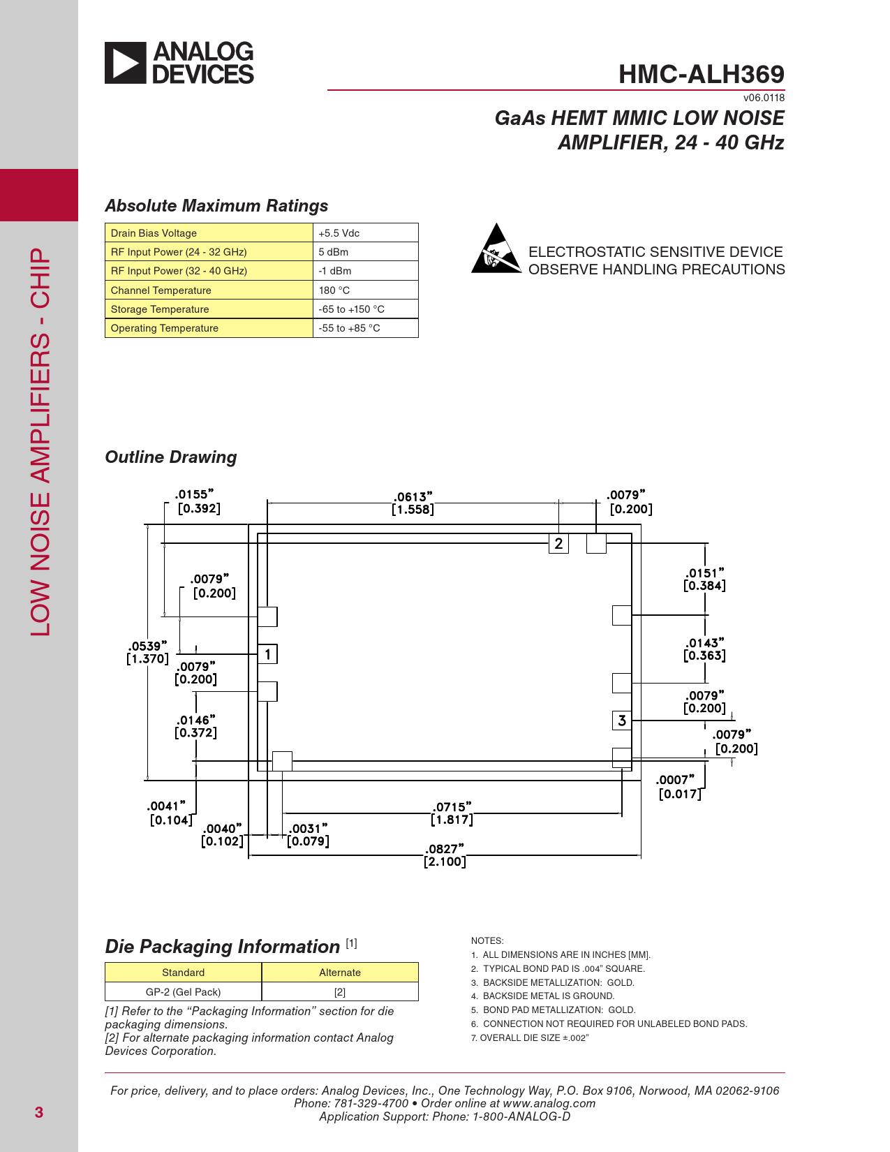 HMC-ALH369 v06.0118 GaAs HEMT MMIC LOW NOISEAMPLIFIER, 24 - 40 GHzAbsolute Maximum Ratings Drain Bias Voltage +5.5 Vdc IP RF Input Power (24 - 32 GHz) 5 dBm ELECTROSTATIC SENSITIVE DEVICE H RF Input Power (32 - 40 GHz) -1 dBm OBSERVE HANDLING PRECAUTIONS Channel Temperature 180 °C C - Storage Temperature -65 to +150 °C S Operating Temperature -55 to +85 °C R IE LIF P M Outline Drawing A E IS O N W LO NOTES: Die Packaging Information [1] 1. ALL DIMENSIONS ARE IN INCHES [MM]. 2. TYPICAL BOND PAD IS .004” SQUARE. Standard Alternate 3. BACKSIDE METALLIZATION: GOLD. GP-2 (Gel Pack) [2] 4. BACKSIDE METAL IS GROUND. 5. BOND PAD METALLIZATION: GOLD. [1] Refer to the “Packaging Information” section for die packaging dimensions. 6. CONNECTION NOT REQUIRED FOR UNLABELED BOND PADS. [2] For alternate packaging information contact Analog 7. OVERALL DIE SIZE ±.002” Devices Corporation. For price, delivery, and to place orders: Analog Devices, Inc., One Technology Way, P.O. Box 9106, Norwood, MA 02062-9106 Phone: 781-329-4700 • Order online at www.analog.com 3 Application Support: Phone: 1-800-ANALOG-D