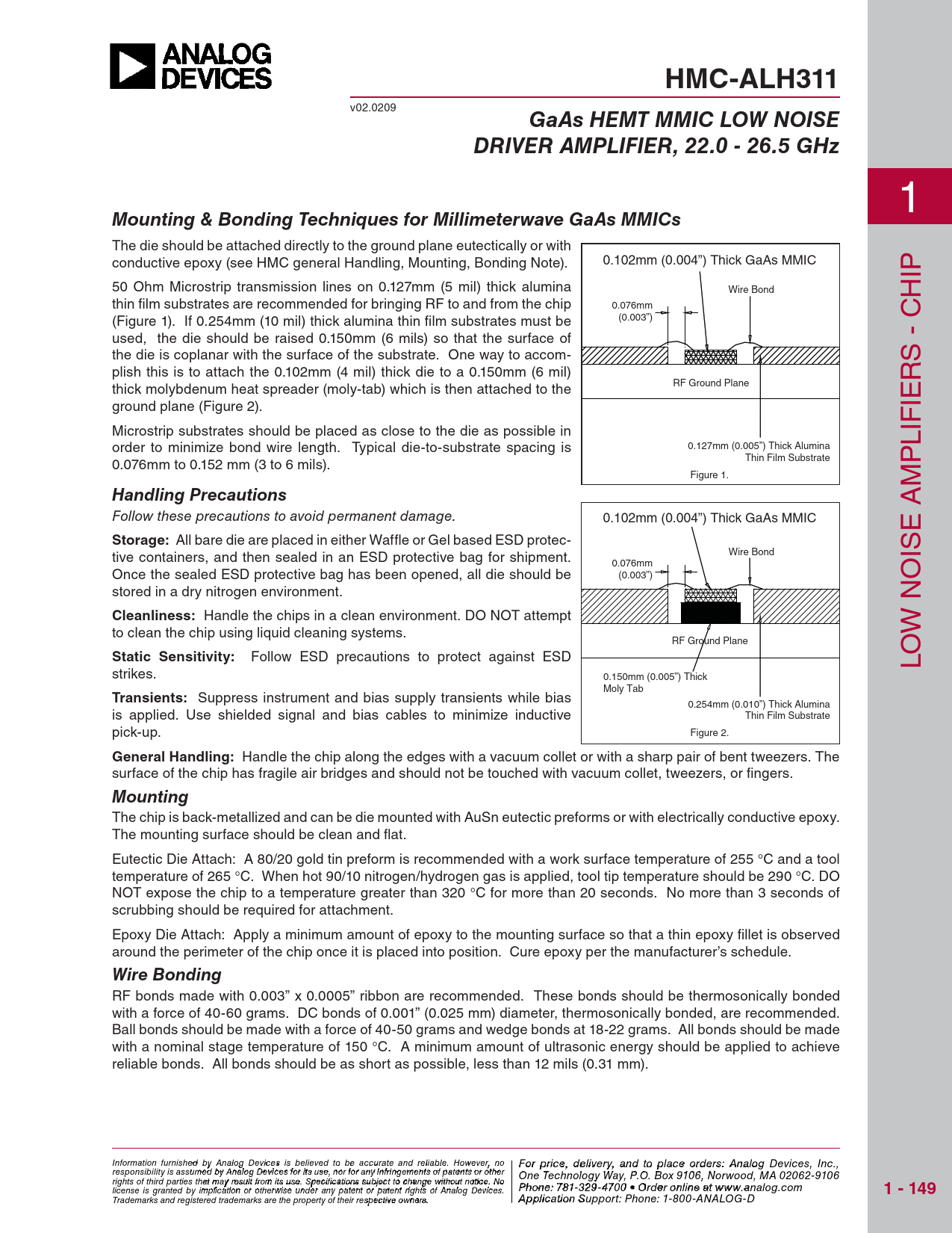 HMC-ALH311 v02.0209 GaAs HEMT MMIC LOW NOISEDRIVER AMPLIFIER, 22.0 - 26.5 GHz 1 Mounting & Bonding Techniques for Millimeterwave GaAs MMICs The die should be attached directly to the ground plane eutectically or with conductive epoxy (see HMC general Handling, Mounting, Bonding Note). 0.102mm (0.004”) Thick GaAs MMIC IP 50 Ohm Microstrip transmission lines on 0.127mm (5 mil) thick alumina Wire Bond H thin fi lm substrates are recommended for bringing RF to and from the chip 0.076mm (Figure 1). If 0.254mm (10 mil) thick alumina thin fi lm substrates must be (0.003”) C used, the die should be raised 0.150mm (6 mils) so that the surface of - the die is coplanar with the surface of the substrate. One way to accom- plish this is to attach the 0.102mm (4 mil) thick die to a 0.150mm (6 mil) RS RF Ground Plane thick molybdenum heat spreader (moly-tab) which is then attached to the ground plane (Figure 2). IE IF Microstrip substrates should be placed as close to the die as possible in 0.127mm (0.005”) Thick Alumina L order to minimize bond wire length. Typical die-to-substrate spacing is Thin Film Substrate P 0.076mm to 0.152 mm (3 to 6 mils). Figure 1. M Handling Precautions A Follow these precautions to avoid permanent damage. 0.102mm (0.004”) Thick GaAs MMIC E Storage: All bare die are placed in either Waffle or Gel based ESD protec- tive containers, and then sealed in an ESD protective bag for shipment. Wire Bond IS 0.076mm Once the sealed ESD protective bag has been opened, all die should be (0.003”) O stored in a dry nitrogen environment. N Cleanliness: Handle the chips in a clean environment. DO NOT attempt to clean the chip using liquid cleaning systems. W RF Ground Plane O Static Sensitivity: Follow ESD precautions to protect against ESD L strikes. 0.150mm (0.005”) Thick Moly Tab Transients: Suppress instrument and bias supply transients while bias 0.254mm (0.010”) Thick Alumina is applied. Use shielded signal and bias cables to minimize inductive Thin Film Substrate pick-up. Figure 2. General Handling: Handle the chip along the edges with a vacuum collet or with a sharp pair of bent tweezers. The surface of the chip has fragile air bridges and should not be touched with vacuum collet, tweezers, or fi ngers. Mounting The chip is back-metallized and can be die mounted with AuSn eutectic preforms or with electrically conductive epoxy. The mounting surface should be clean and fl at. Eutectic Die Attach: A 80/20 gold tin preform is recommended with a work surface temperature of 255 °C and a tool temperature of 265 °C. When hot 90/10 nitrogen/hydrogen gas is applied, tool tip temperature should be 290 °C. DO NOT expose the chip to a temperature greater than 320 °C for more than 20 seconds. No more than 3 seconds of scrubbing should be required for attachment. Epoxy Die Attach: Apply a minimum amount of epoxy to the mounting surface so that a thin epoxy fi llet is observed around the perimeter of the chip once it is placed into position. Cure epoxy per the manufacturer’s schedule. Wire Bonding RF bonds made with 0.003” x 0.0005” ribbon are recommended. These bonds should be thermosonically bonded with a force of 40-60 grams. DC bonds of 0.001” (0.025 mm) diameter, thermosonically bonded, are recommended. Ball bonds should be made with a force of 40-50 grams and wedge bonds at 18-22 grams. All bonds should be made with a nominal stage temperature of 150 °C. A minimum amount of ultrasonic energy should be applied to achieve reliable bonds. All bonds should be as short as possible, less than 12 mils (0.31 mm). Information furnish F e o d r pri by An ce, de alog Devic leis vie s rby eli, a eve nd to pla d to be accur ce o ate an r d der relia s ble , pl . Ho ease co wever, no For price, delivery, and to place orders: Analog Devices, Inc., responsibility is assumed by Analog Devices for its use, nor for any infringements of patents or other ntact Hittite Microwave Corporation: One Technology Way, P.O. Box 9106, Norwood, MA 02062-9106 20 Alpha Road, Chelmsford, MA 01824 Phone rights of third parties that may result from its use. Specifications subject to change without notice. No : 978 Phon -e25 : 7 0 81 - - 3 3 3 29 4 - 3 F 470 ax 0 • O : 978 rder o - nl 25 in 0 e a - t 33 ww 73 license is granted by implication or otherwise under any patent or patent rights of Analog Devices. w.analog.com 1 - 149 Order On- Trademarks and registered trademarks are the property of their respective owners. line at www.hi A tptipte.co licatio m n Support: Phone: 1-800-ANALOG-D