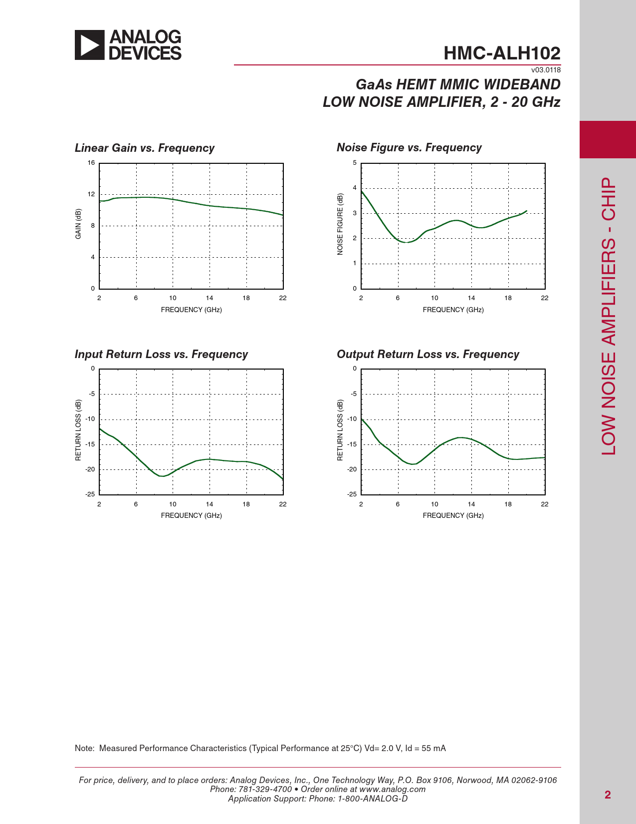 HMC-ALH102 v03.0118 GaAs HEMT MMIC WIDEBANDLOW NOISE AMPLIFIER, 2 - 20 GHzLinear Gain vs. FrequencyNoise Figure vs. Frequency 16 5 4 12 ) IP B d ( ) H E B 3 d R ( U 8 IN IG C A F G E 2 - IS O S N 4 1 R IE 0 0 2 6 10 14 18 22 2 6 10 14 18 22 LIF FREQUENCY (GHz) FREQUENCY (GHz) P M A Input Return Loss vs. FrequencyOutput Return Loss vs. Frequency E 0 0 IS -5 -5 O ) B B (d (d S S N -10 S -10 S O O L L W N N -15 UR -15 UR T T LO RE RE -20 -20 -25 -25 2 6 10 14 18 22 2 6 10 14 18 22 FREQUENCY (GHz) FREQUENCY (GHz) Note: Measured Performance Characteristics (Typical Performance at 25°C) Vd= 2.0 V, Id = 55 mA For price, delivery, and to place orders: Analog Devices, Inc., One Technology Way, P.O. Box 9106, Norwood, MA 02062-9106 Phone: 781-329-4700 • Order online at www.analog.com Application Support: Phone: 1-800-ANALOG-D 2