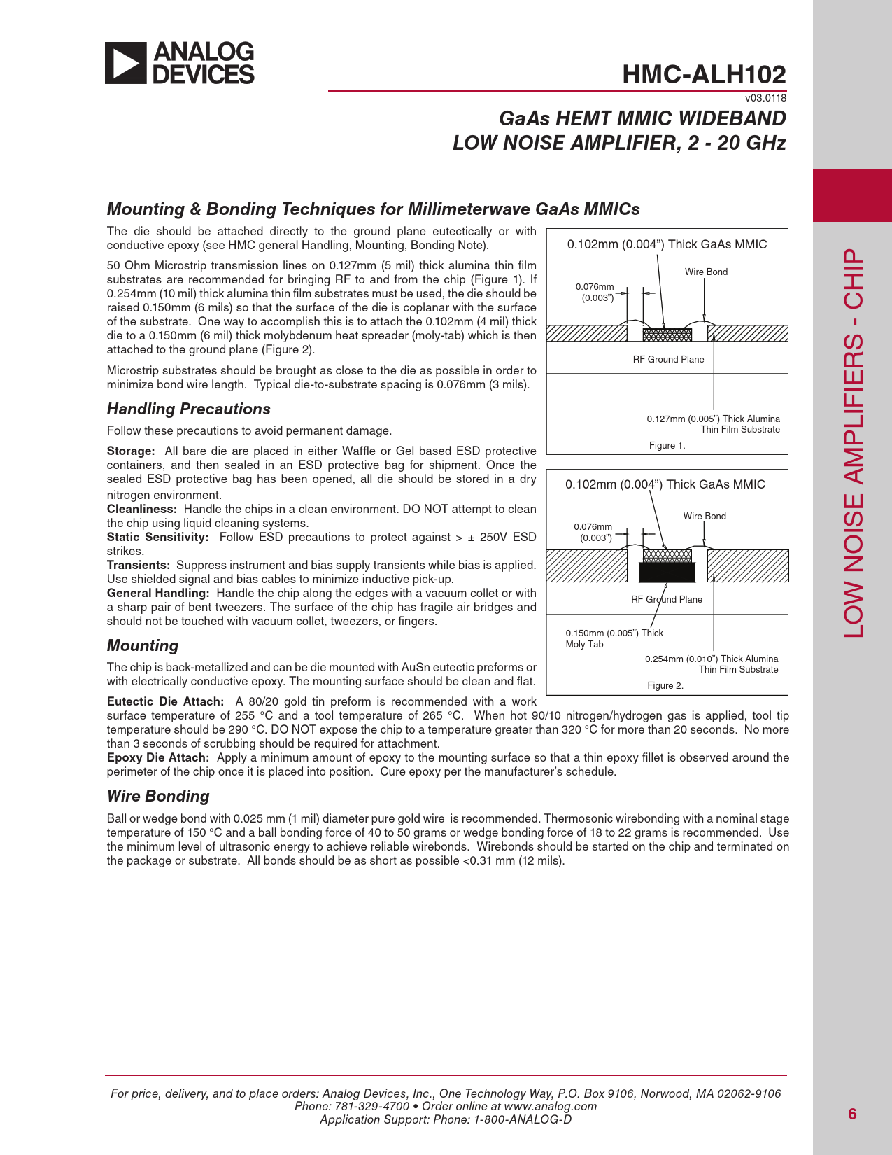 HMC-ALH102 v03.0118 GaAs HEMT MMIC WIDEBANDLOW NOISE AMPLIFIER, 2 - 20 GHzMounting & Bonding Techniques for Millimeterwave GaAs MMICs The die should be attached directly to the ground plane eutectically or with conductive epoxy (see HMC general Handling, Mounting, Bonding Note). 0.102mm (0.004”) Thick GaAs MMIC 50 Ohm Microstrip transmission lines on 0.127mm (5 mil) thick alumina thin film Wire Bond IP substrates are recommended for bringing RF to and from the chip (Figure 1). If 0.076mm H 0.254mm (10 mil) thick alumina thin film substrates must be used, the die should be (0.003”) raised 0.150mm (6 mils) so that the surface of the die is coplanar with the surface C of the substrate. One way to accomplish this is to attach the 0.102mm (4 mil) thick - die to a 0.150mm (6 mil) thick molybdenum heat spreader (moly-tab) which is then attached to the ground plane (Figure 2). S RF Ground Plane Microstrip substrates should be brought as close to the die as possible in order to R minimize bond wire length. Typical die-to-substrate spacing is 0.076mm (3 mils). IE Handling Precautions 0.127mm (0.005”) Thick Alumina Follow these precautions to avoid permanent damage. Thin Film Substrate LIF Figure 1. P Storage: All bare die are placed in either Waffle or Gel based ESD protective containers, and then sealed in an ESD protective bag for shipment. Once the M sealed ESD protective bag has been opened, all die should be stored in a dry 0.102mm (0.004”) Thick GaAs MMIC A nitrogen environment. Cleanliness: Handle the chips in a clean environment. DO NOT attempt to clean E the chip using liquid cleaning systems. Wire Bond 0.076mm IS Static Sensitivity: Follow ESD precautions to protect against > ± 250V ESD (0.003”) strikes. O Transients: Suppress instrument and bias supply transients while bias is applied. Use shielded signal and bias cables to minimize inductive pick-up. N General Handling: Handle the chip along the edges with a vacuum collet or with RF Ground Plane a sharp pair of bent tweezers. The surface of the chip has fragile air bridges and W should not be touched with vacuum collet, tweezers, or fingers. 0.150mm (0.005”) Thick LO Mounting Moly Tab 0.254mm (0.010”) Thick Alumina The chip is back-metallized and can be die mounted with AuSn eutectic preforms or Thin Film Substrate with electrically conductive epoxy. The mounting surface should be clean and flat. Figure 2. Eutectic Die Attach: A 80/20 gold tin preform is recommended with a work surface temperature of 255 °C and a tool temperature of 265 °C. When hot 90/10 nitrogen/hydrogen gas is applied, tool tip temperature should be 290 °C. DO NOT expose the chip to a temperature greater than 320 °C for more than 20 seconds. No more than 3 seconds of scrubbing should be required for attachment. Epoxy Die Attach: Apply a minimum amount of epoxy to the mounting surface so that a thin epoxy fillet is observed around the perimeter of the chip once it is placed into position. Cure epoxy per the manufacturer’s schedule. Wire Bonding Ball or wedge bond with 0.025 mm (1 mil) diameter pure gold wire is recommended. Thermosonic wirebonding with a nominal stage temperature of 150 °C and a ball bonding force of 40 to 50 grams or wedge bonding force of 18 to 22 grams is recommended. Use the minimum level of ultrasonic energy to achieve reliable wirebonds. Wirebonds should be started on the chip and terminated on the package or substrate. All bonds should be as short as possible <0.31 mm (12 mils). For price, delivery, and to place orders: Analog Devices, Inc., One Technology Way, P.O. Box 9106, Norwood, MA 02062-9106 Phone: 781-329-4700 • Order online at www.analog.com Application Support: Phone: 1-800-ANALOG-D 6