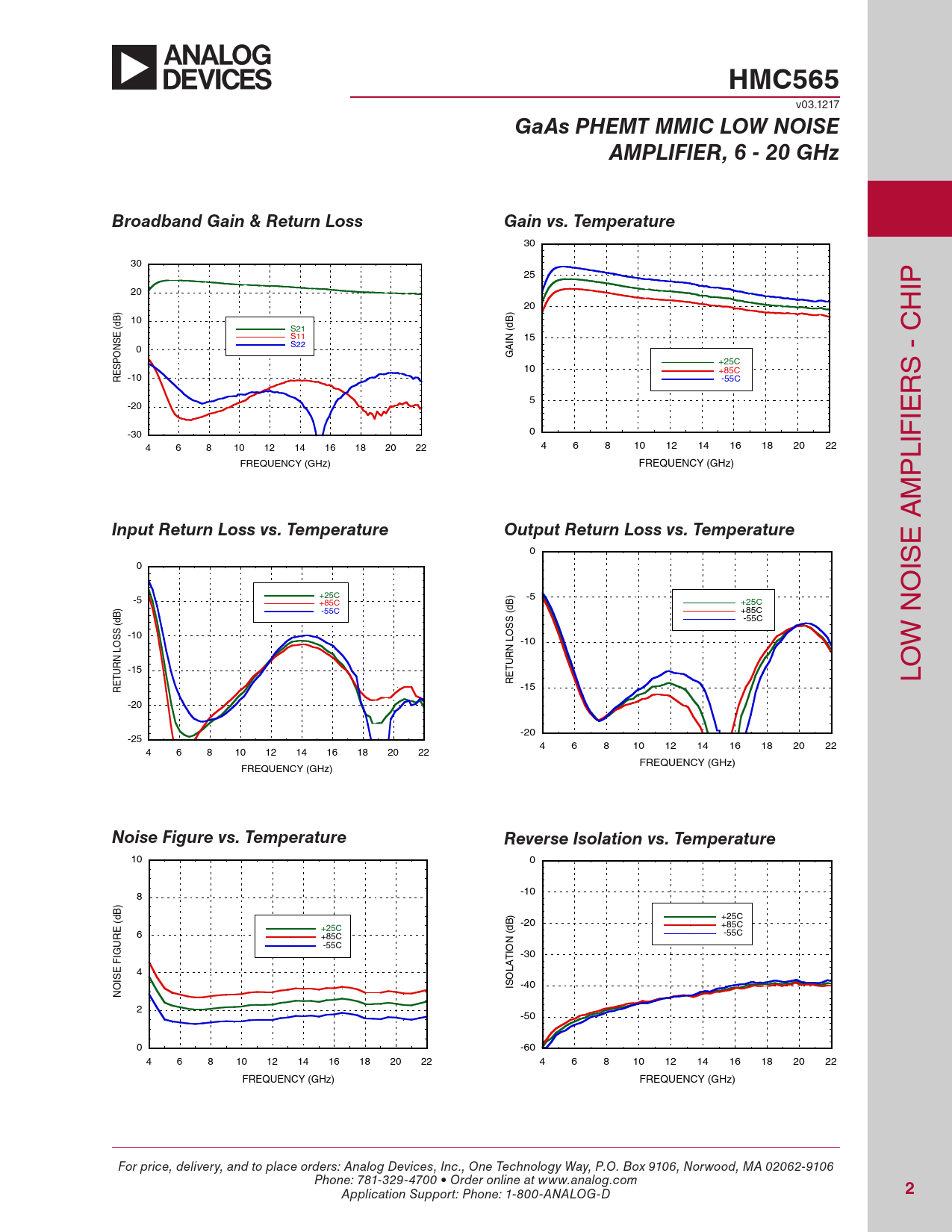 HMC565 v03.1217 GaAs PHEMT MMIC LOW NOISEAMPLIFIER, 6 - 20 GHzBroadband Gain & Return LossGain vs. Temperature 30 30 25 20 IP 20 ) H B) 10 B (d d S21 ( S11 SE 15 IN C S22 N 0 A G - +25C ESPO 10 +85C S R -10 -55C R 5 -20 IE -30 0 4 6 8 10 12 14 16 18 20 22 4 6 8 10 12 14 16 18 20 22 LIF FREQUENCY (GHz) FREQUENCY (GHz) P M A Input Return Loss vs. TemperatureOutput Return Loss vs. Temperature E 0 0 IS O +25C ) -5 -5 +85C B +25C ) -55C +85C B (d S -55C N (d S S O -10 S L -10 O L N W N UR T -15 UR T RE LO -15 RE -20 -20 -25 4 6 8 10 12 14 16 18 20 22 4 6 8 10 12 14 16 18 20 22 FREQUENCY (GHz) FREQUENCY (GHz) Noise Figure vs. TemperatureReverse Isolation vs. Temperature 10 0 -10 8 ) B d ) +25C ( B -20 +25C +85C E d 6 R +85C ( -55C U N -55C IG IO -30 T F A E 4 L IS O O IS -40 N 2 -50 0 -60 4 6 8 10 12 14 16 18 20 22 4 6 8 10 12 14 16 18 20 22 FREQUENCY (GHz) FREQUENCY (GHz) For price, delivery, and to place orders: Analog Devices, Inc., One Technology Way, P.O. Box 9106, Norwood, MA 02062-9106 Phone: 781-329-4700 • Order online at www.analog.com Application Support: Phone: 1-800-ANALOG-D 2