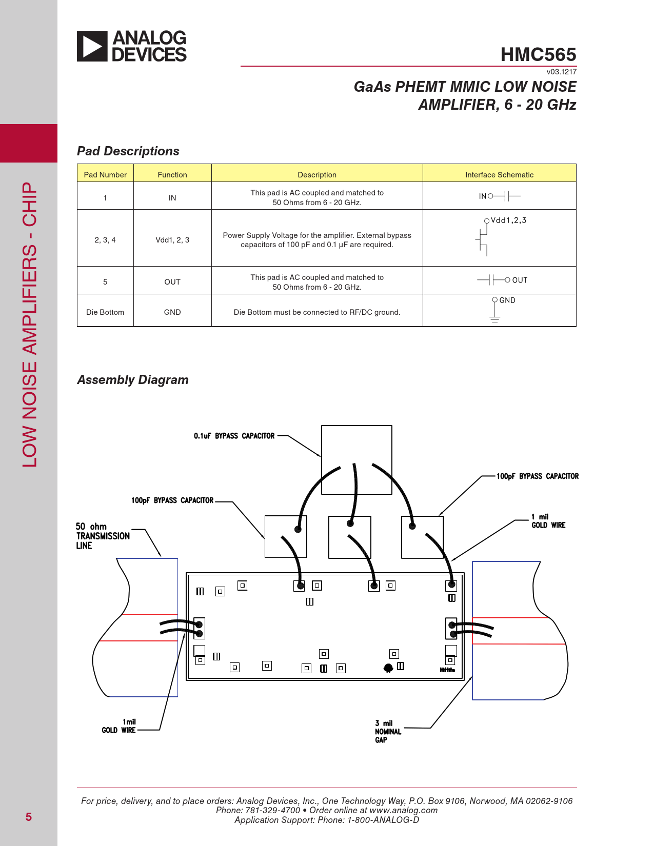 HMC565. GaAs PHEMT MMIC LOW NOISE. AMPLIFIER, 6 - 20 GHz. Pad Descriptions. Assembly Diagram