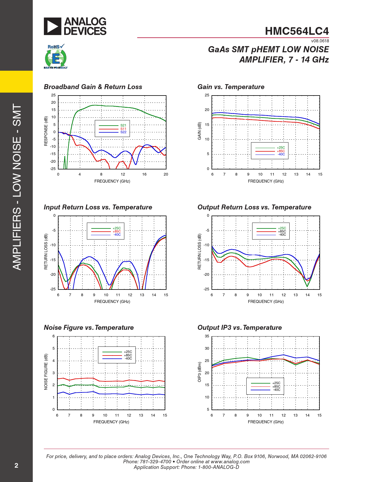 HMC564LC4 v08.0618 GaAs SMT pHEMT LOW NOISEAMPLIFIER, 7 - 14 GHzBroadband Gain & Return LossGain vs. Temperature 25 25 T 20 M 15 20 10 B) (d ) 5 S21 B 15 SE d S11 ( N 0 S22 IN E - S A -5 G 10 ESPO IS R -10 +25C +85C O -15 5 -40C -20 -25 0 W N 0 4 8 12 16 20 6 7 8 9 10 11 12 13 14 15 O FREQUENCY (GHz) FREQUENCY (GHz) S - L Input Return Loss vs. TemperatureOutput Return Loss vs. Temperature R 0 0 IE +25C +25C -5 -5 +85C +85C ) -40C -40C B B LIF (d (d S S P -10 -10 S S O O L L M N N -15 -15 A UR UR T T RE RE -20 -20 -25 -25 6 7 8 9 10 11 12 13 14 15 6 7 8 9 10 11 12 13 14 15 FREQUENCY (GHz) FREQUENCY (GHz) Noise Figure vs. TemperatureOutput IP3 vs. Temperature 6 35 5 30 +25C ) +85C B d -40C ( 4 25 E ) R m U (dB IG 3 20 3 F E IP O IS +25C 2 O 15 +85C N -40C 1 10 0 5 6 7 8 9 10 11 12 13 14 15 6 7 8 9 10 11 12 13 14 15 FREQUENCY (GHz) FREQUENCY (GHz) For price, delivery, and to place orders: Analog Devices, Inc., One Technology Way, P.O. Box 9106, Norwood, MA 02062-9106 Phone: 781-329-4700 • Order online at www.analog.com 2 Application Support: Phone: 1-800-ANALOG-D