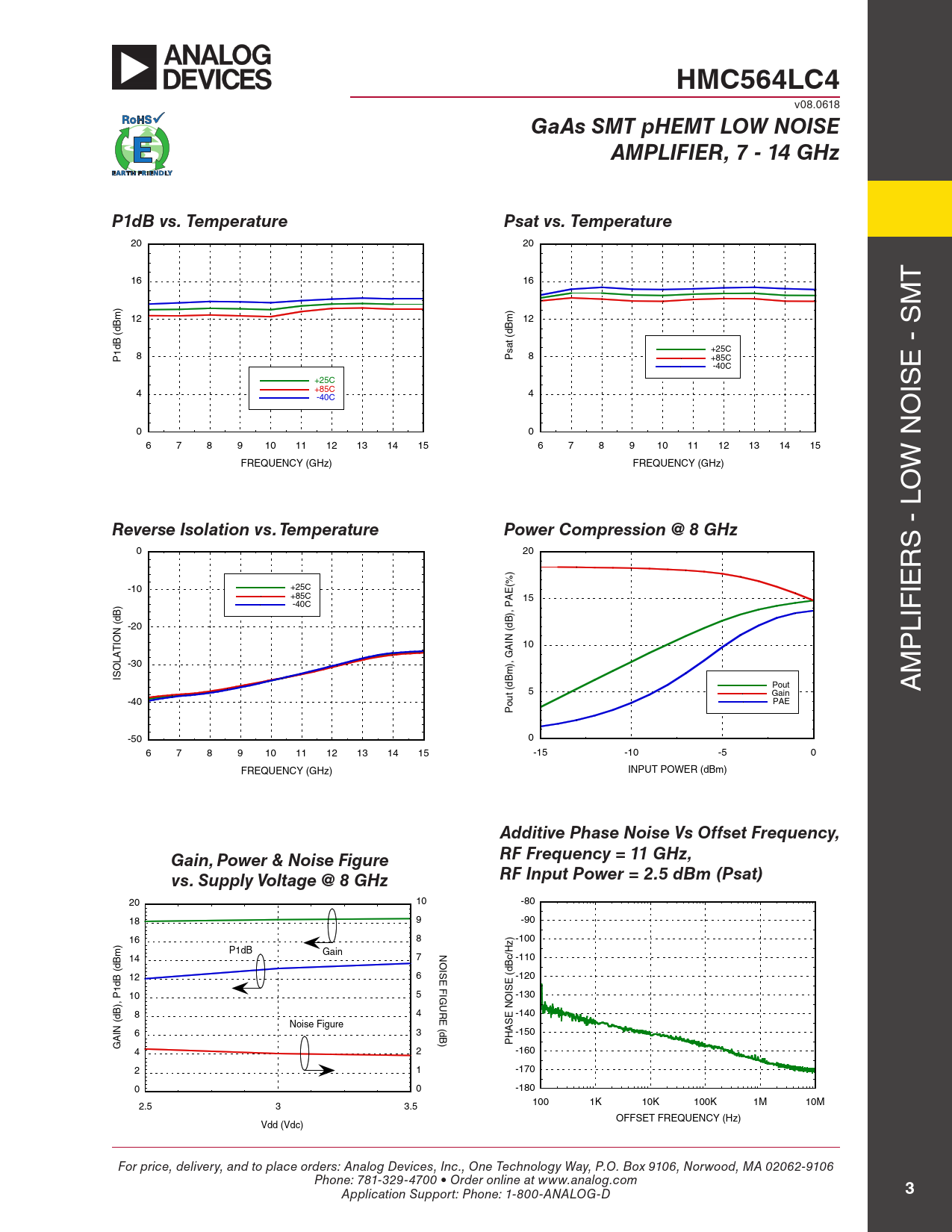 20 10 -80 18 9 -90 16 8 ) -100 ) z m P1dB Gain N /H B 14 7 O -110 d Bc ( IS (d B 12 6 E -120 d F 1 ISE 10 5 IG -130 O ), P U N B R d 8 4 E -140 ( Noise Figure ( IN ASE 6 3 d -150 A B ) G PH 4 2 -160 2 1 -170 0 0 -180 100 1K 10K 100K 1M 10M 2.5 3 3.5 OFFSET FREQUENCY (Hz) Vdd (Vdc) For price, delivery, and to place orders: Analog Devices, Inc., One Technology Way, P.O. Box 9106, Norwood, MA 02062-9106 Phone: 781-329-4700 • Order online at www.analog.com Application Support: Phone: 1-800-ANALOG-D