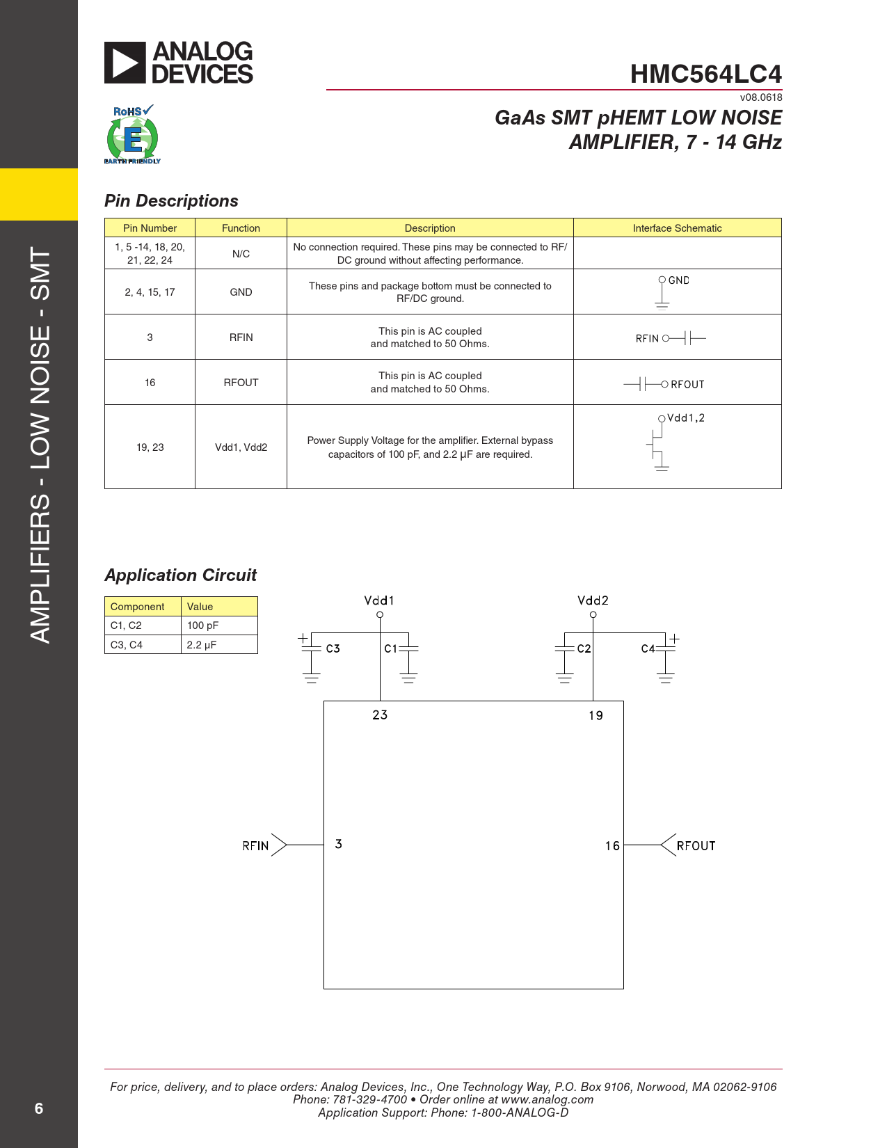 HMC564LC4 GaAs SMT pHEMT LOW NOISE AMPLIFIER, 7 - 14 GHz Pin Descriptions Application Circuit
