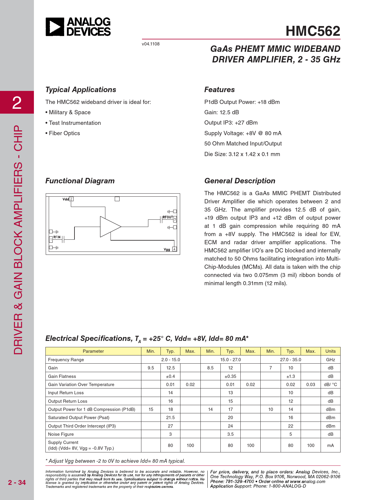 HMC562. GaAs PHEMT MMIC WIDEBAND. DRIVER AMPLIFIER, 2 - 35 GHz. Typical Applications. Features. Functional Diagram